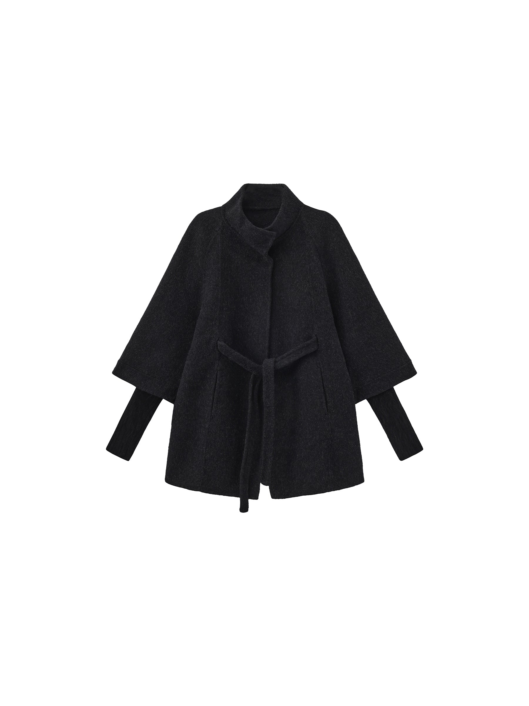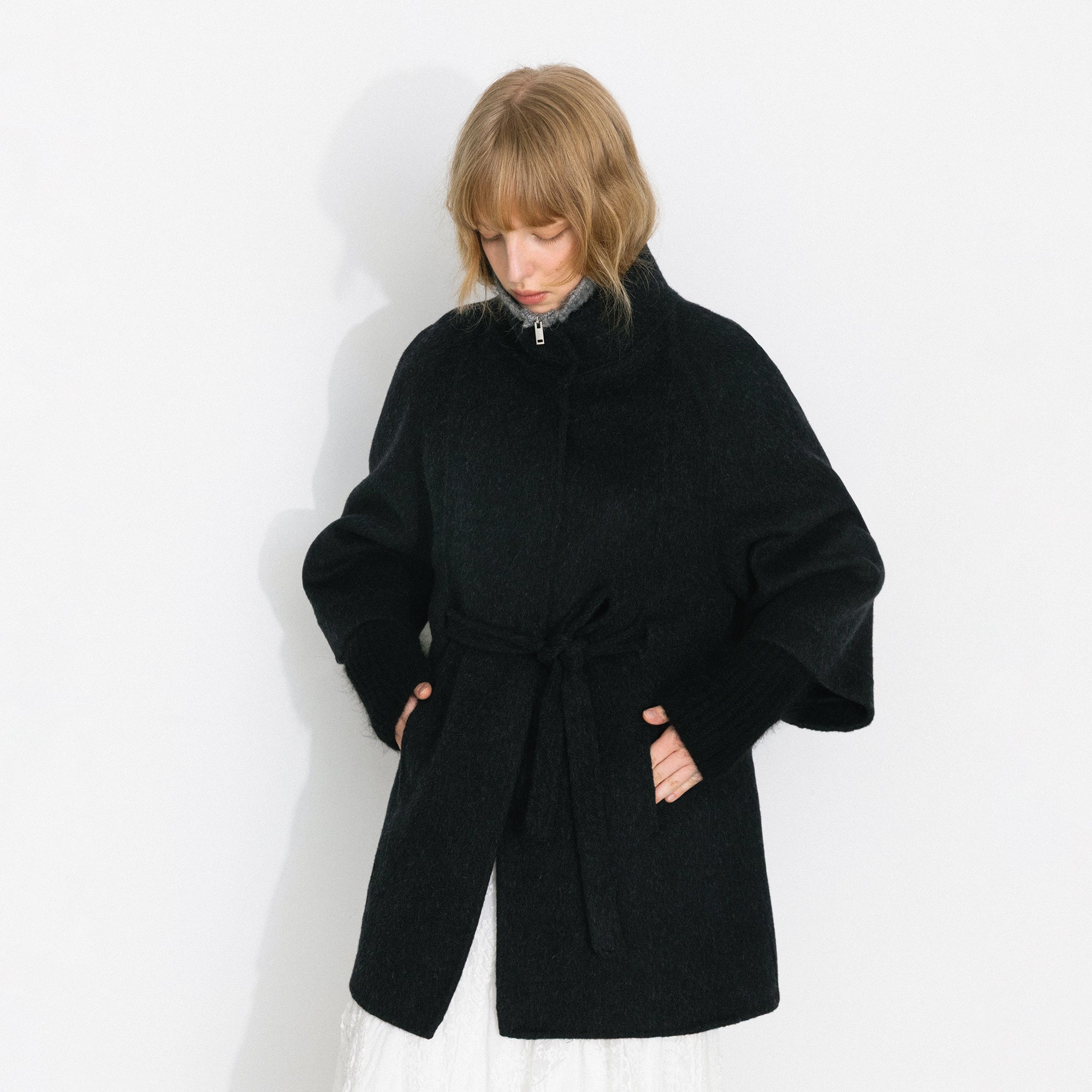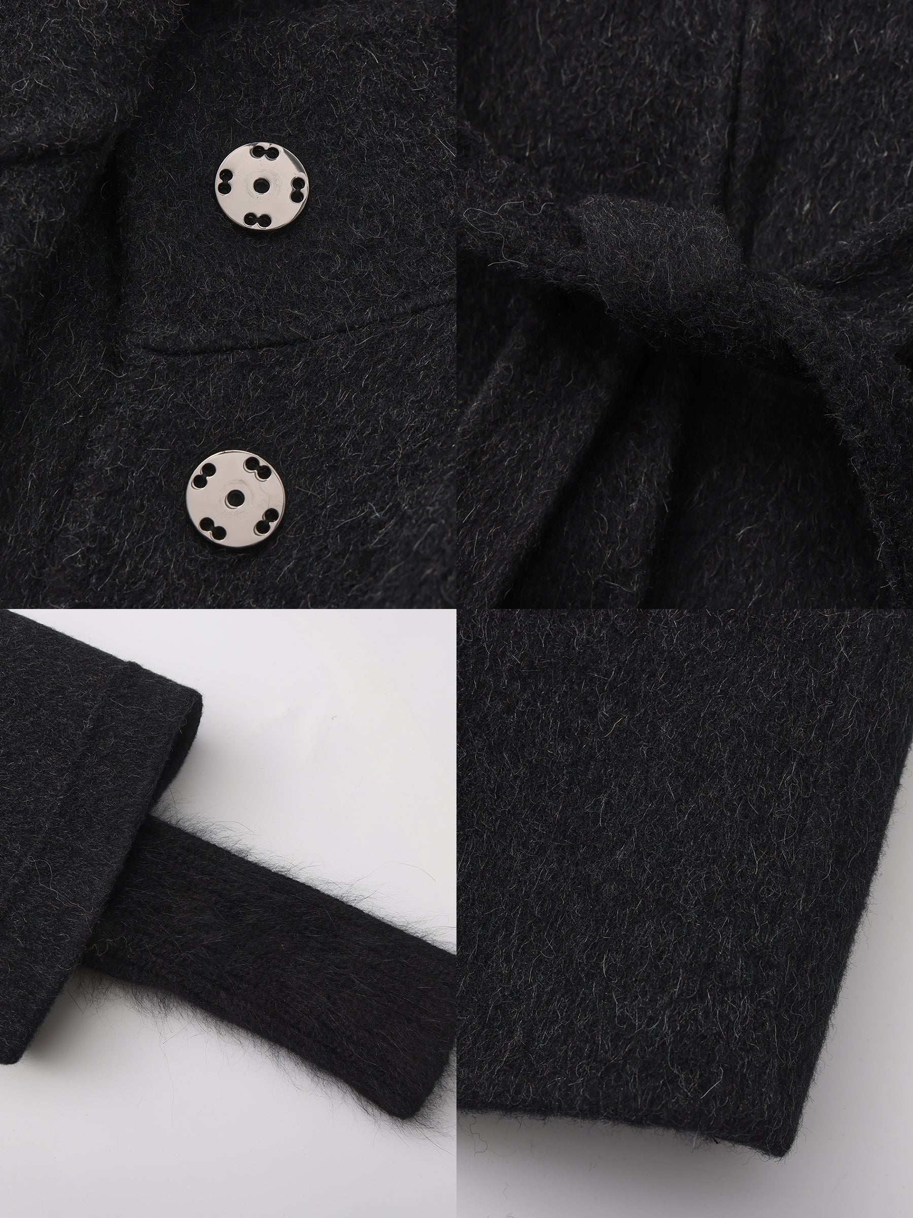 Minimal Wool-Blend Waist-Defined Coat in black. Relaxed cocoon silhouette blends Cozy Chic style—perfectly capturing the current comfortable-minimalist trend. Long and elegant, it flatters all body types and works effortlessly for both office and casual looks. Waist Belt for a personalized fit; tied, it adds a touch of effortless sophistication. Soft, skin-friendly knit contrasts with the wool-blend coat, creating visual depth and enhanced comfort.