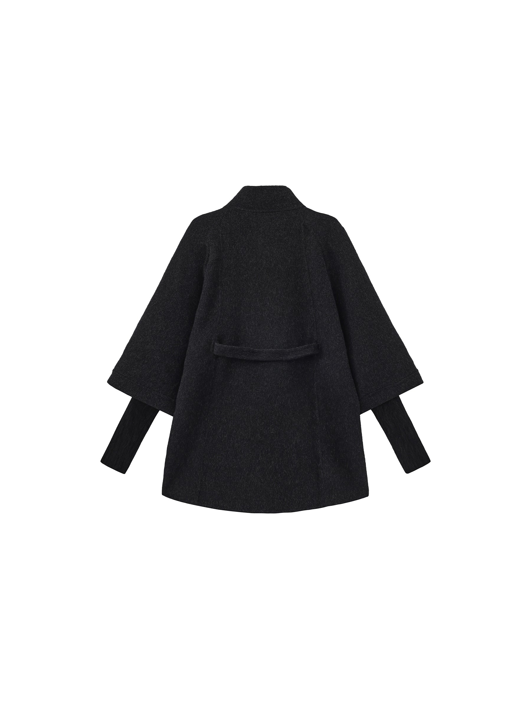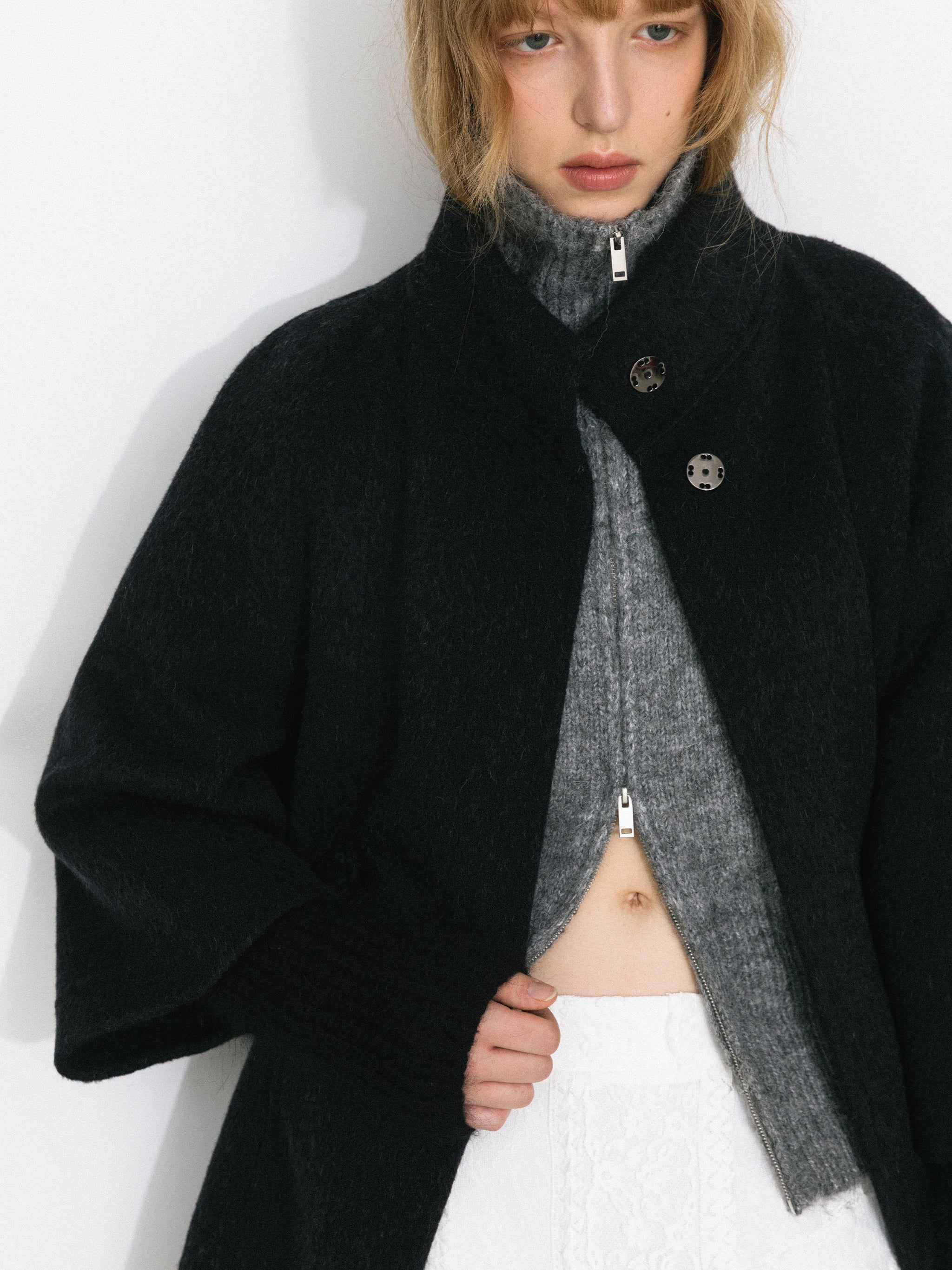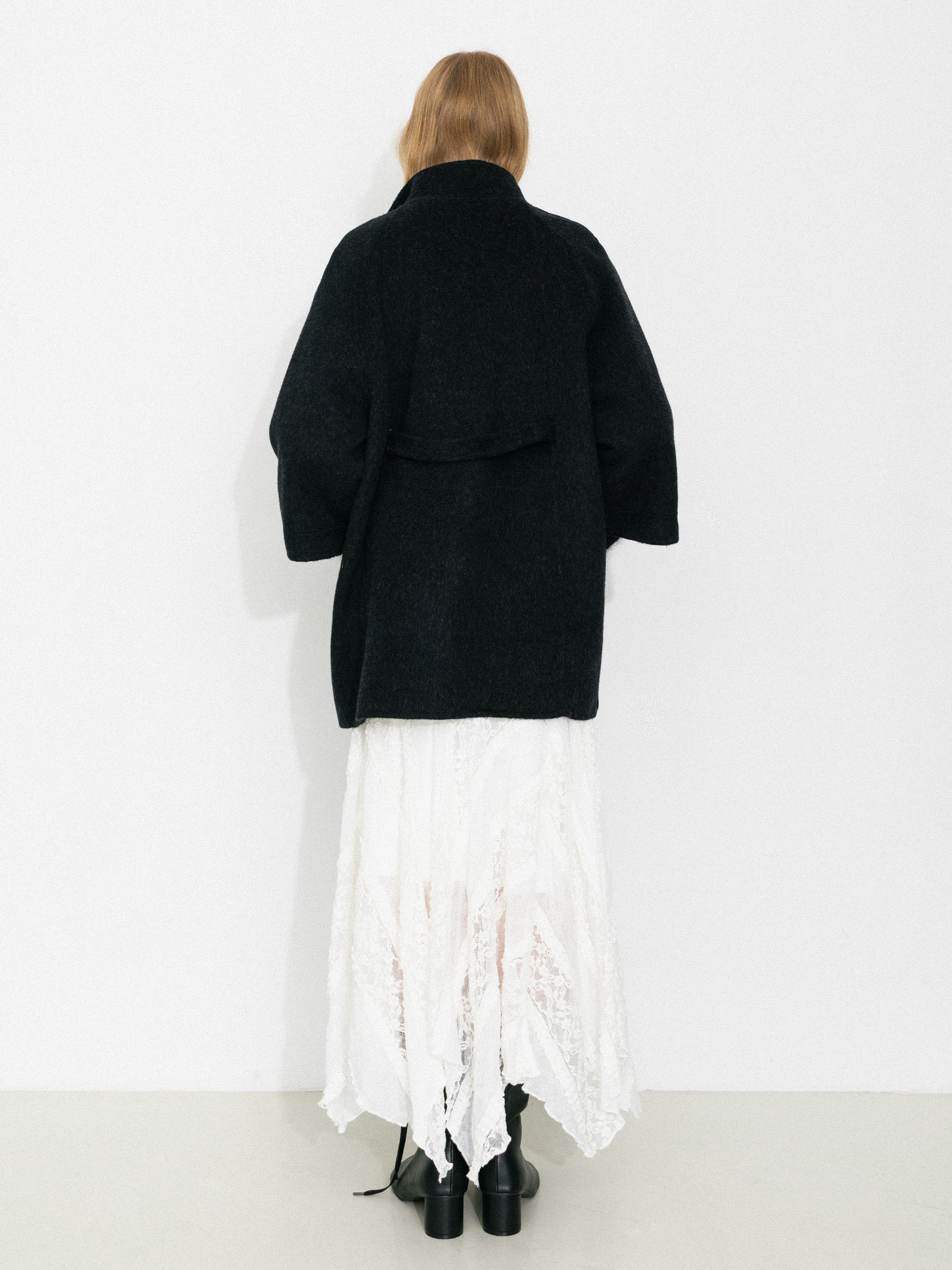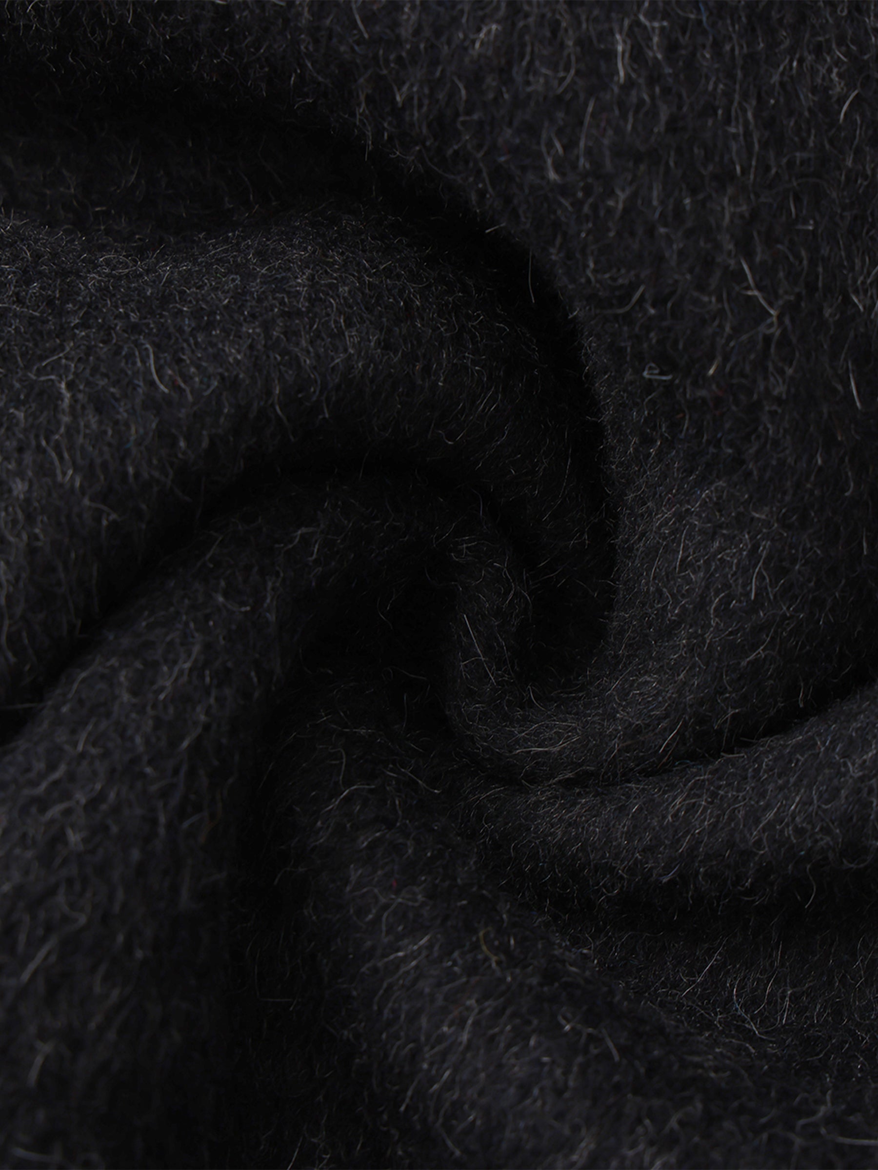 Minimal Wool-Blend Waist-Defined Coat in black. Relaxed cocoon silhouette blends Cozy Chic style—perfectly capturing the current comfortable-minimalist trend. Long and elegant, it flatters all body types and works effortlessly for both office and casual looks. Waist Belt for a personalized fit; tied, it adds a touch of effortless sophistication. Soft, skin-friendly knit contrasts with the wool-blend coat, creating visual depth and enhanced comfort.