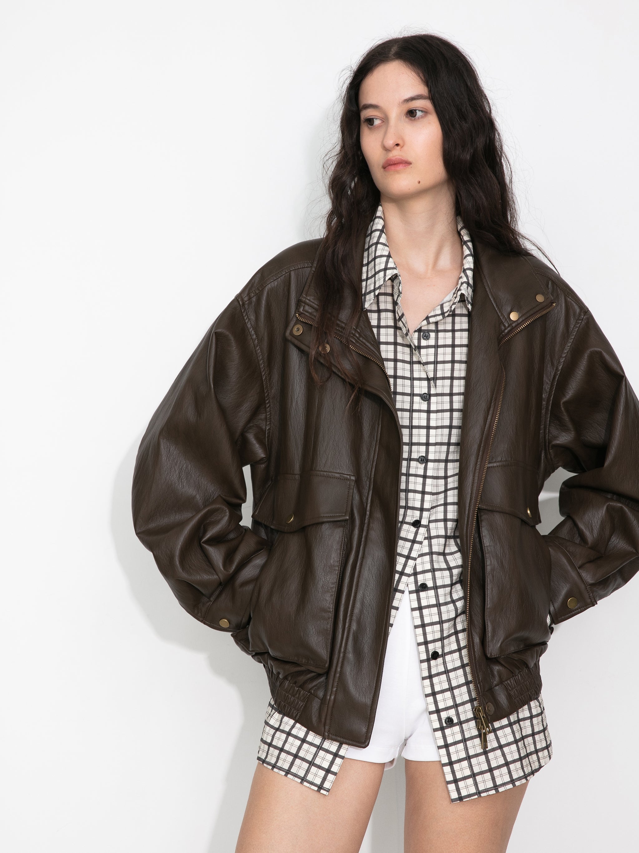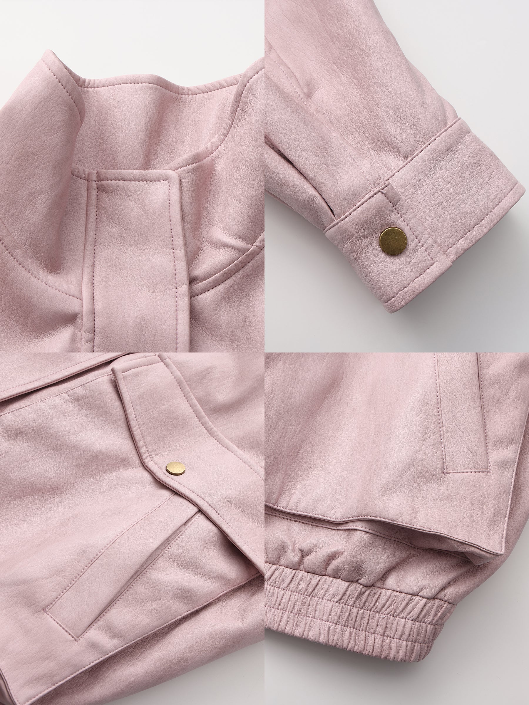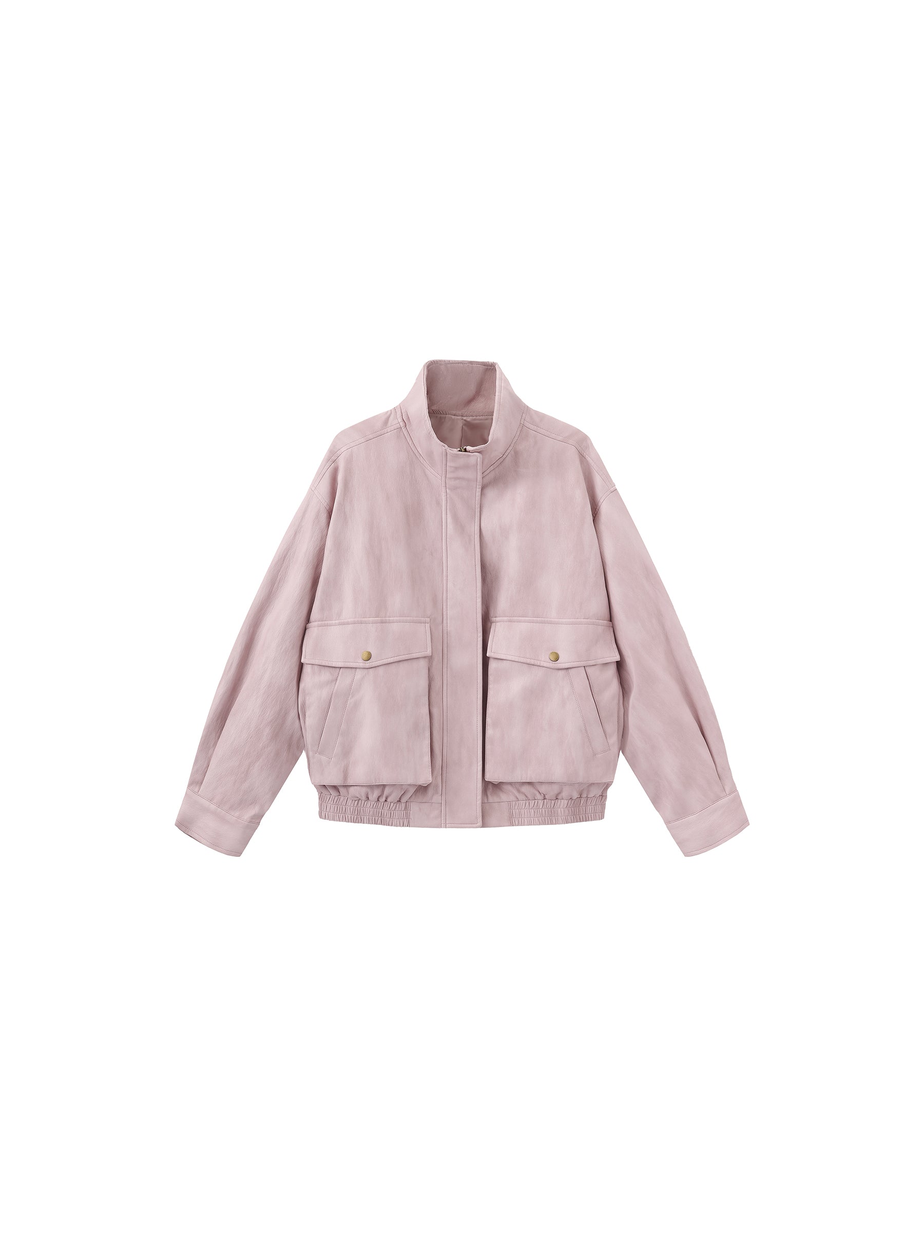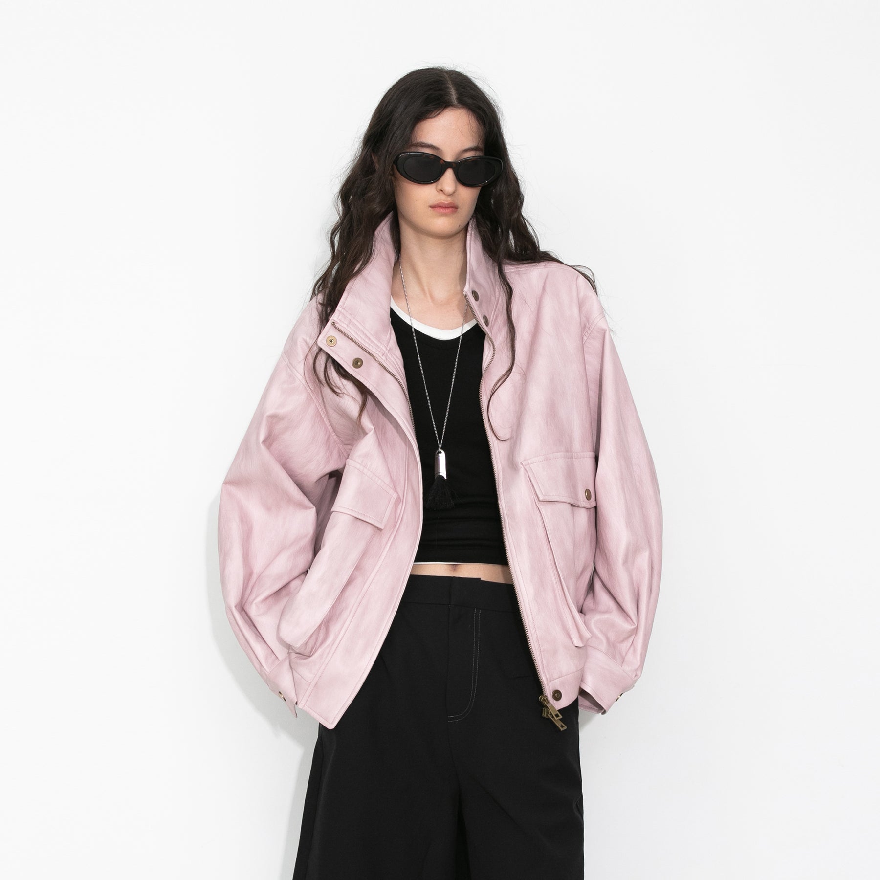 Stand collar vintage faux leather jacket in pink/brown. Featuring a stand collar and large front pockets, this jacket is designed in an oversized silhouette for a relaxed, vintage-inspired look. The fabric composition is 100% PU,with100% polyester Lining. Model wears size UN, which is suitable for UK size 8-12. Product Code: COBEC6009