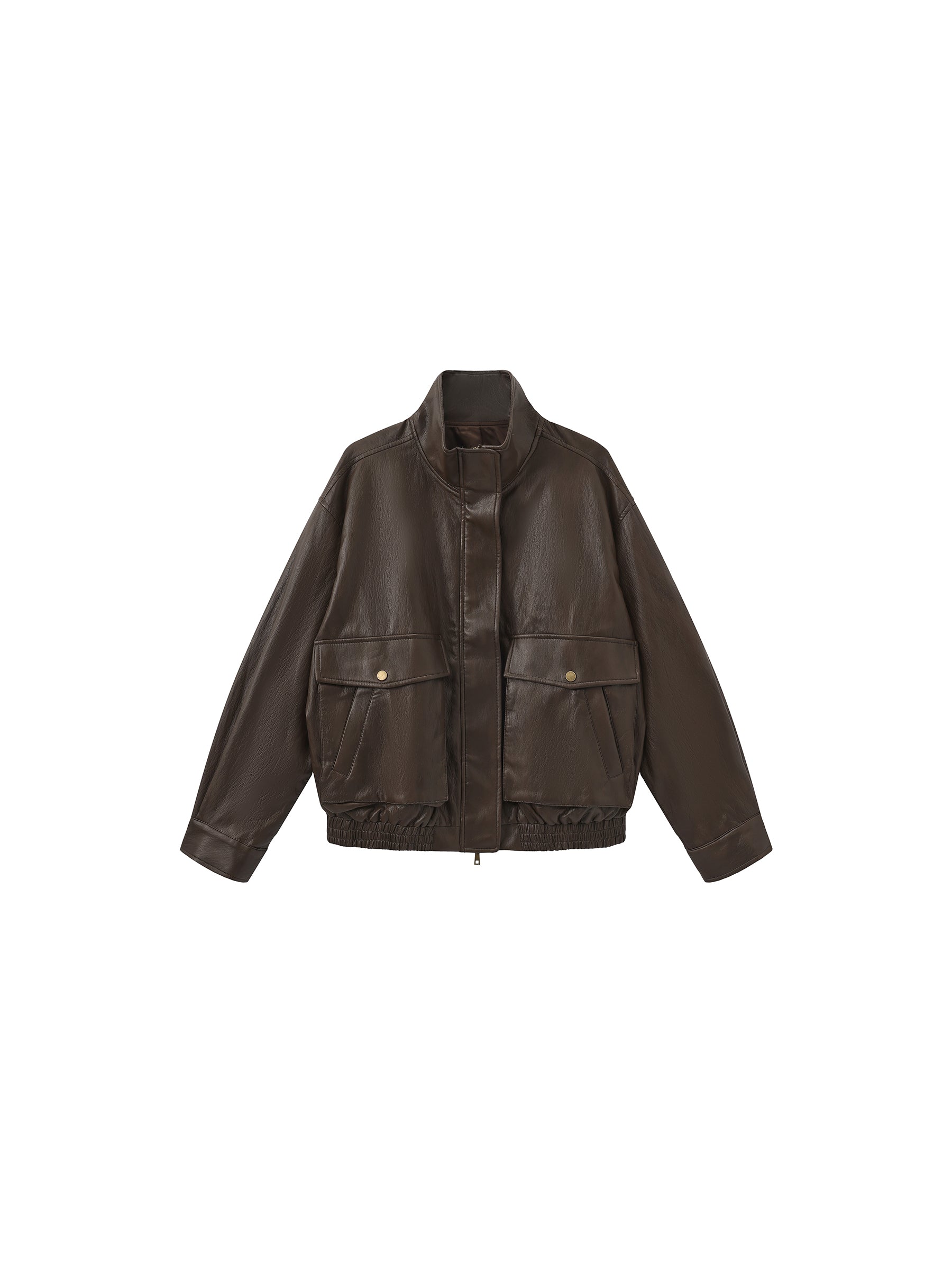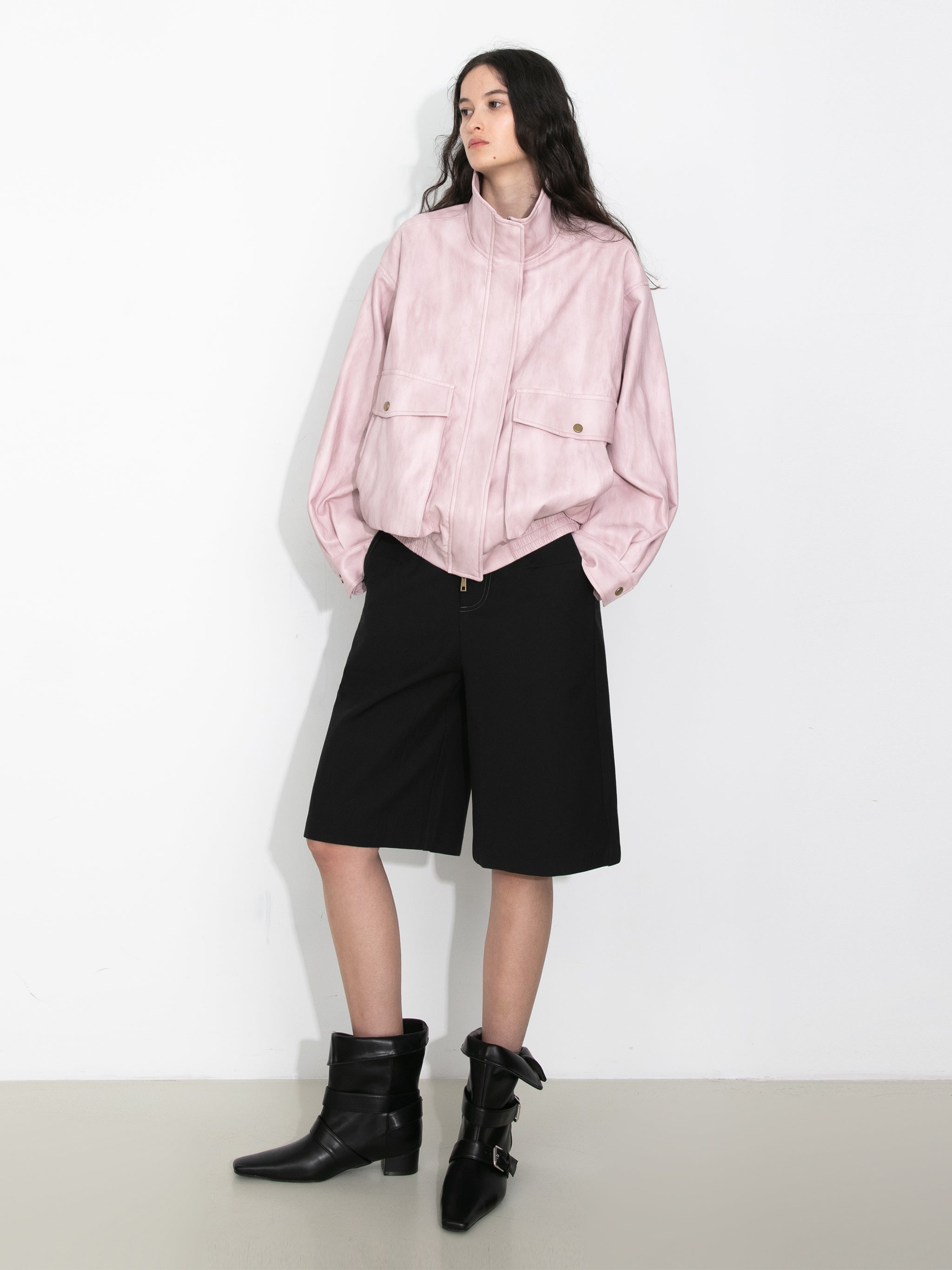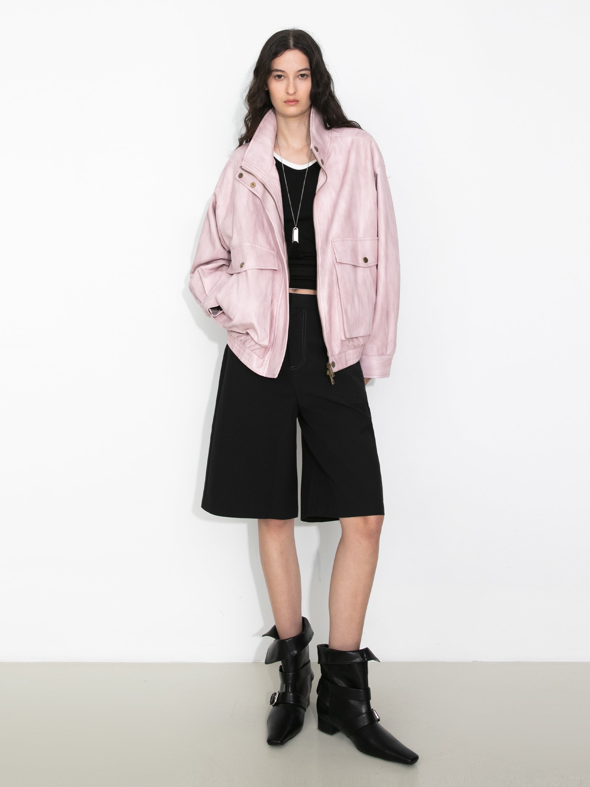 Stand collar vintage faux leather jacket in pink/brown. Featuring a stand collar and large front pockets, this jacket is designed in an oversized silhouette for a relaxed, vintage-inspired look. The fabric composition is 100% PU,with100% polyester Lining. Model wears size UN, which is suitable for UK size 8-12. Product Code: COBEC6009