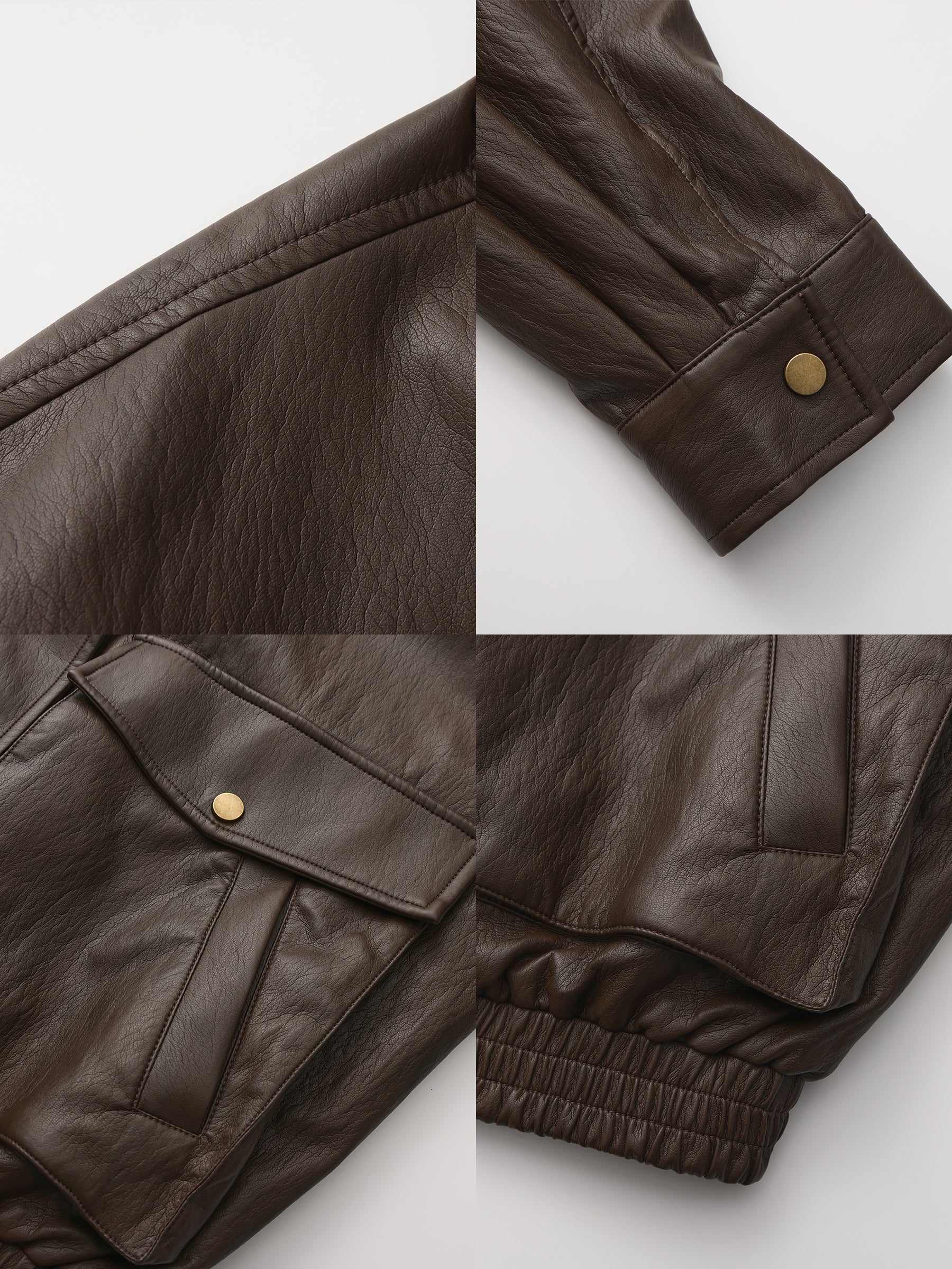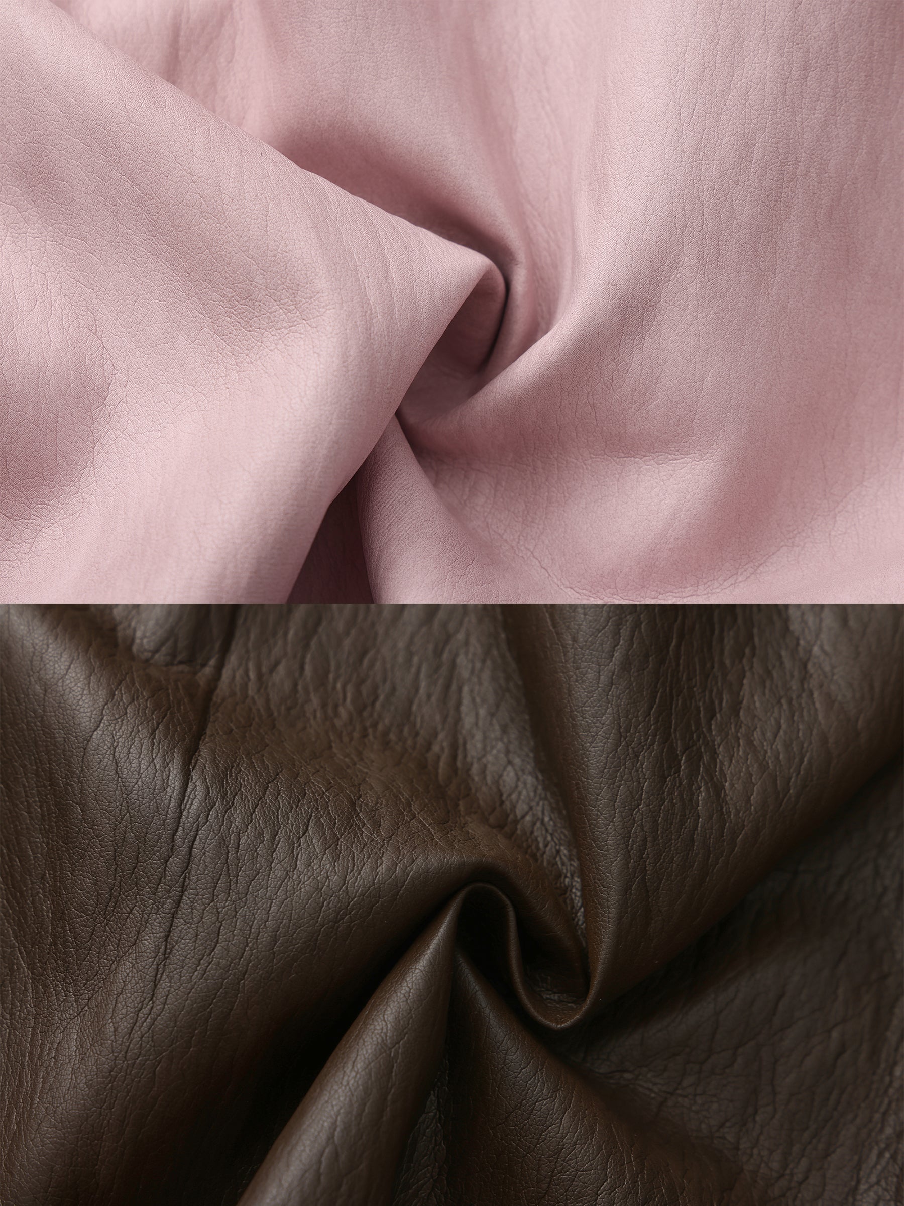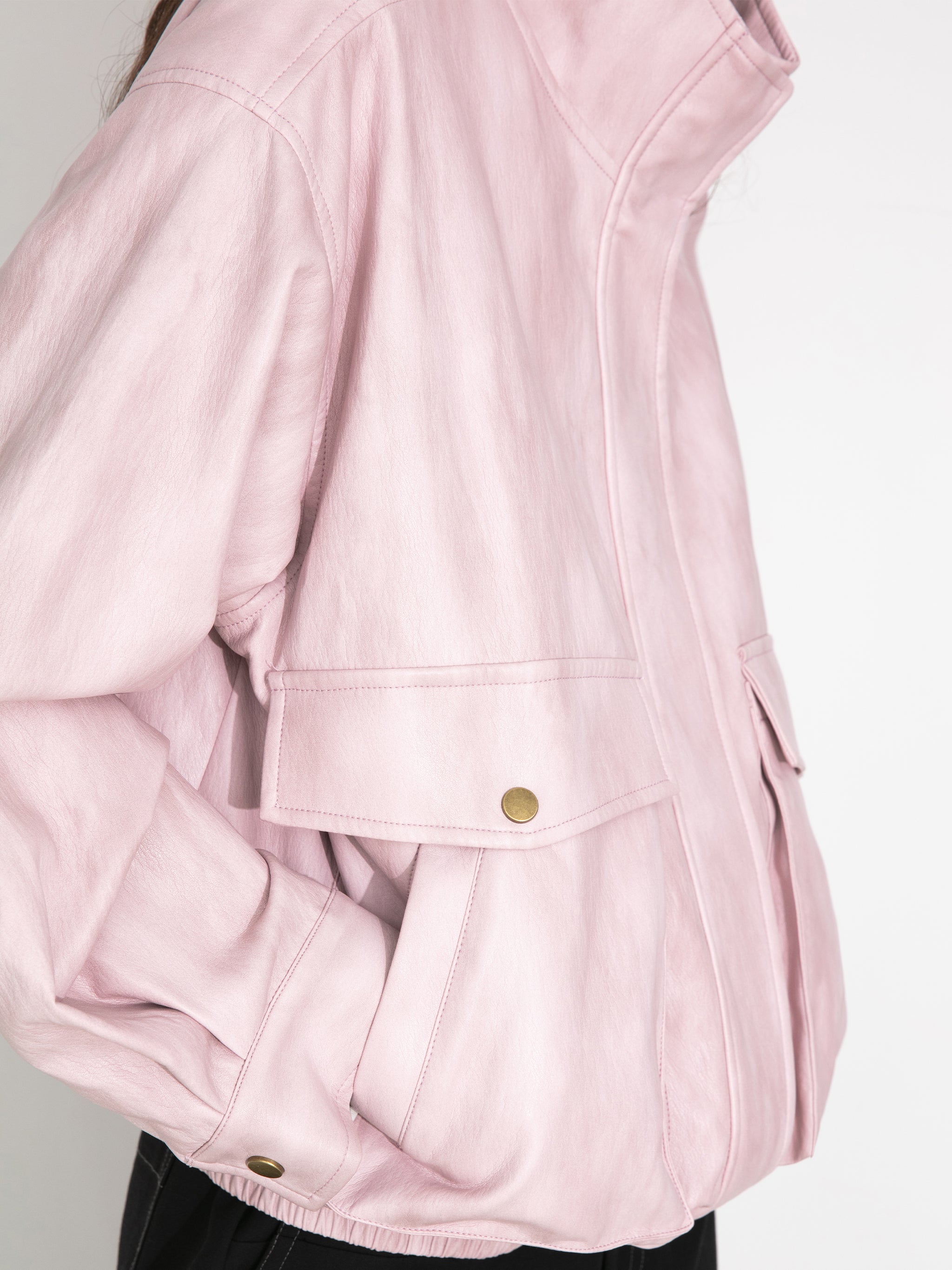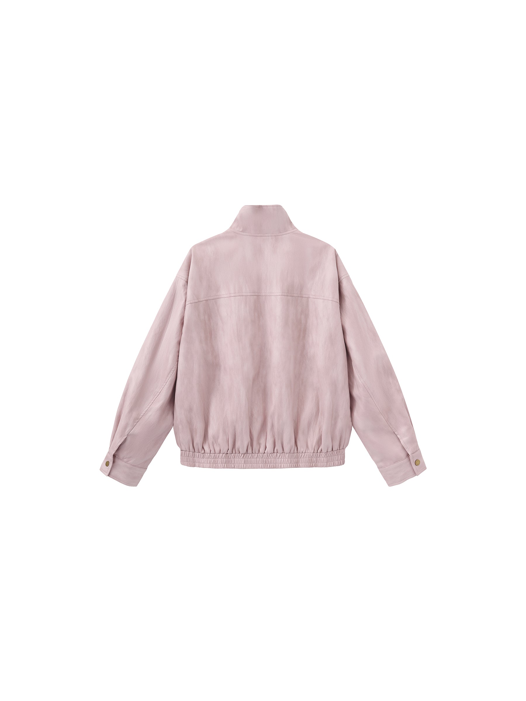 Stand collar vintage faux leather jacket in pink/brown. Featuring a stand collar and large front pockets, this jacket is designed in an oversized silhouette for a relaxed, vintage-inspired look. The fabric composition is 100% PU,with100% polyester Lining. Model wears size UN, which is suitable for UK size 8-12. Product Code: COBEC6009