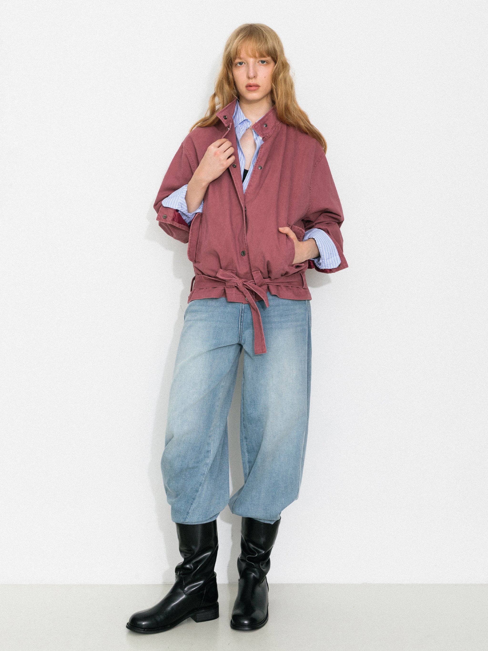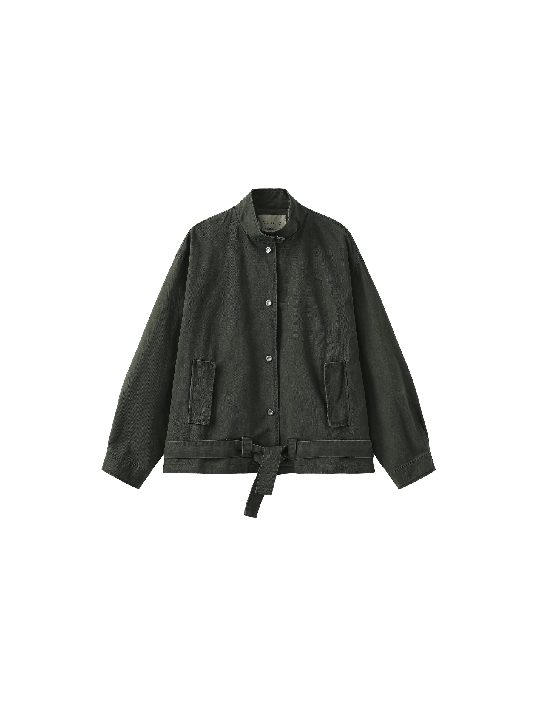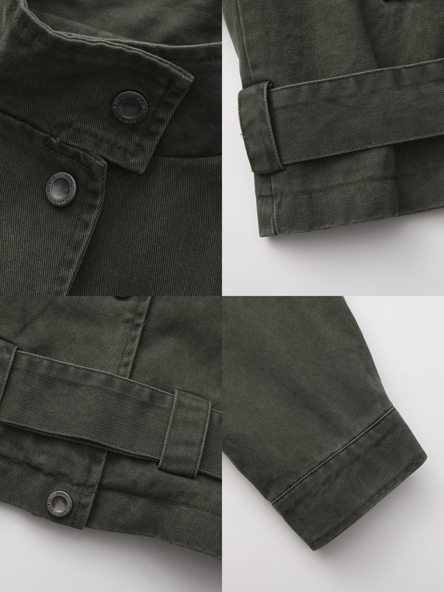 Crafted in a cropped straight-cut silhouette, this jacket blends vintage utility details with a casual urban aesthetic. A modern take on retro-inspired streetwear, it features a stand collar, low waist belt, and snap-button closures for a functional yet stylish finish. The fabric composition: 100% Cotton; Lining: 100% Polyester. Product Code: COBEC6013