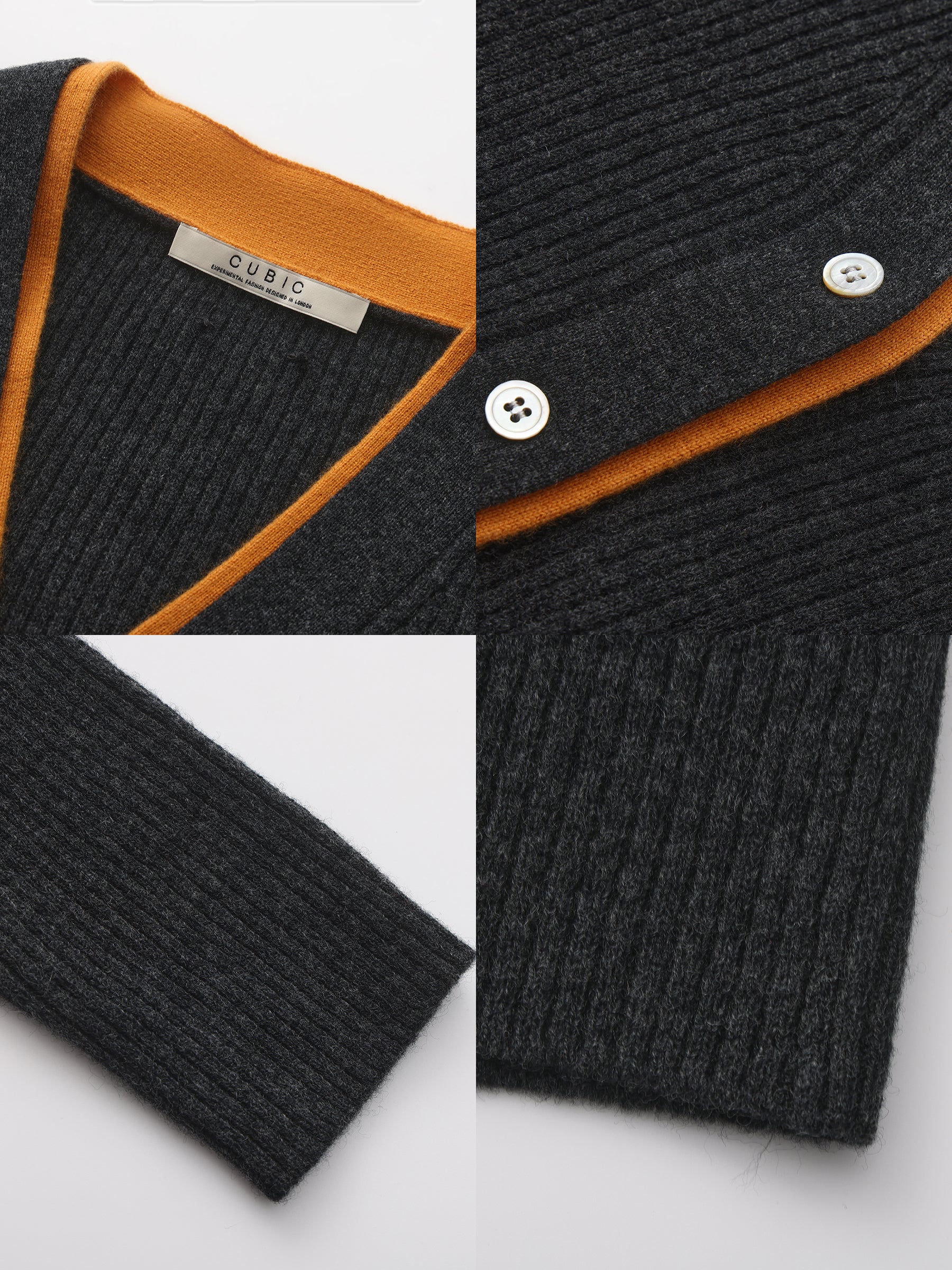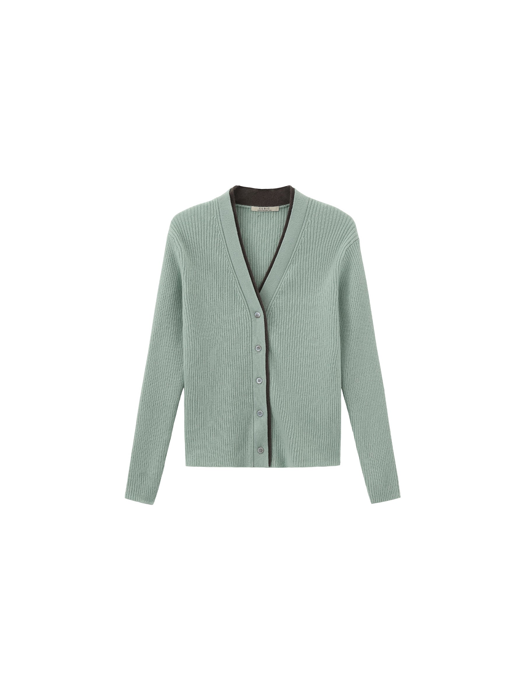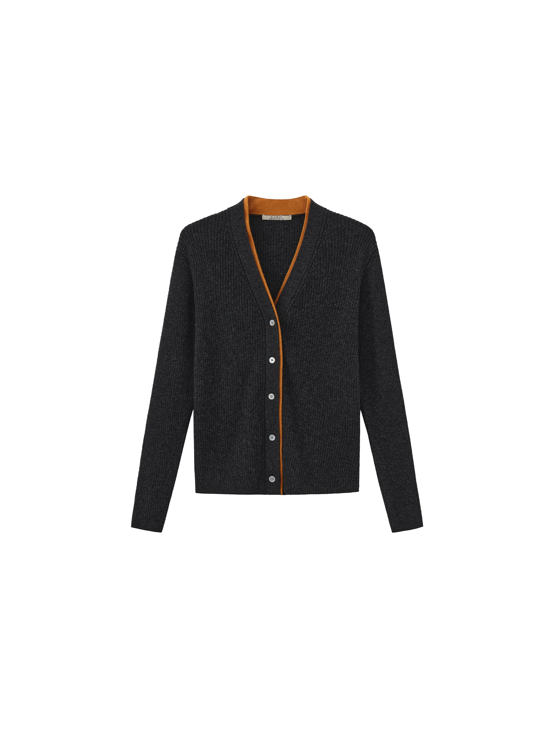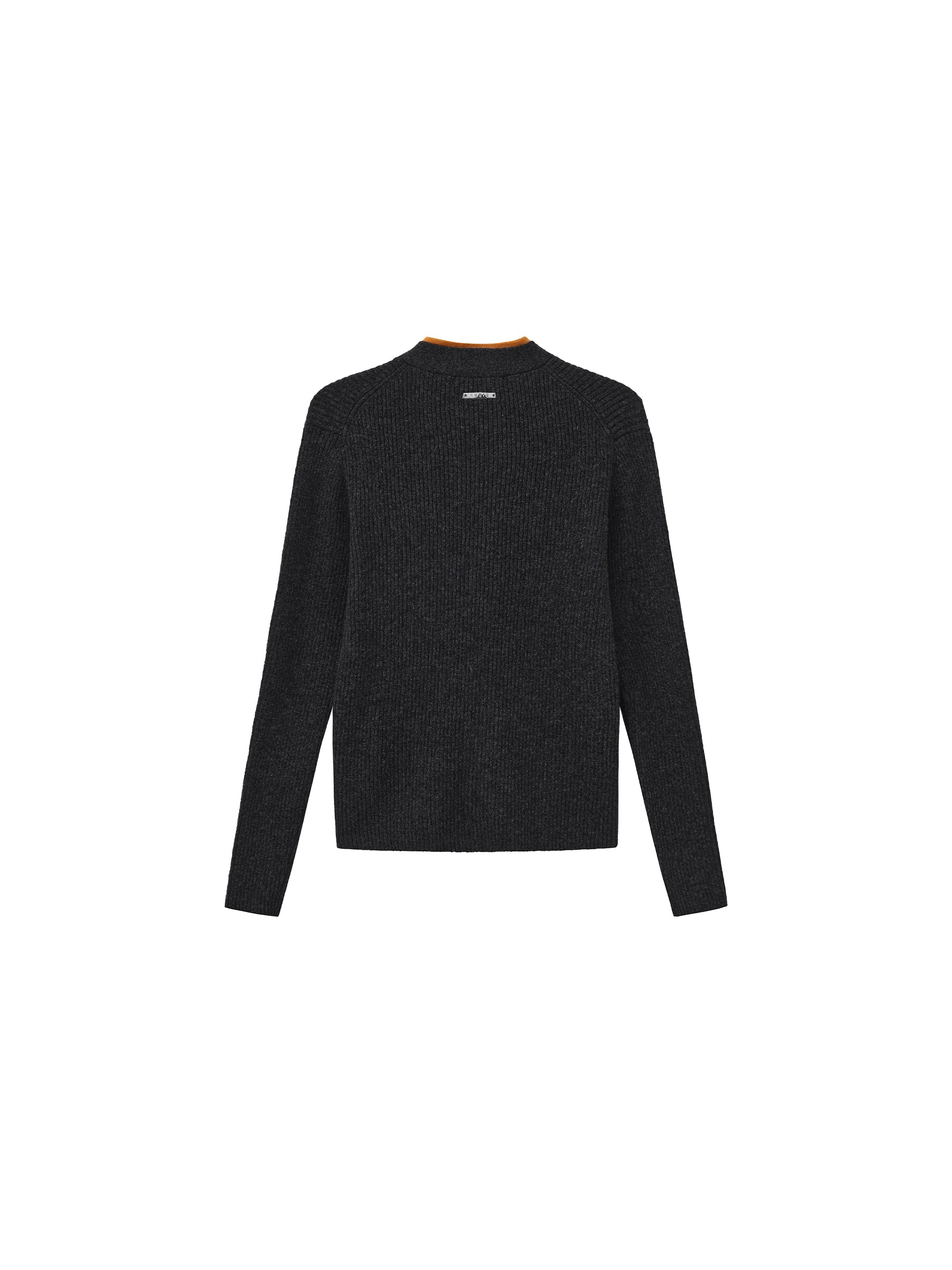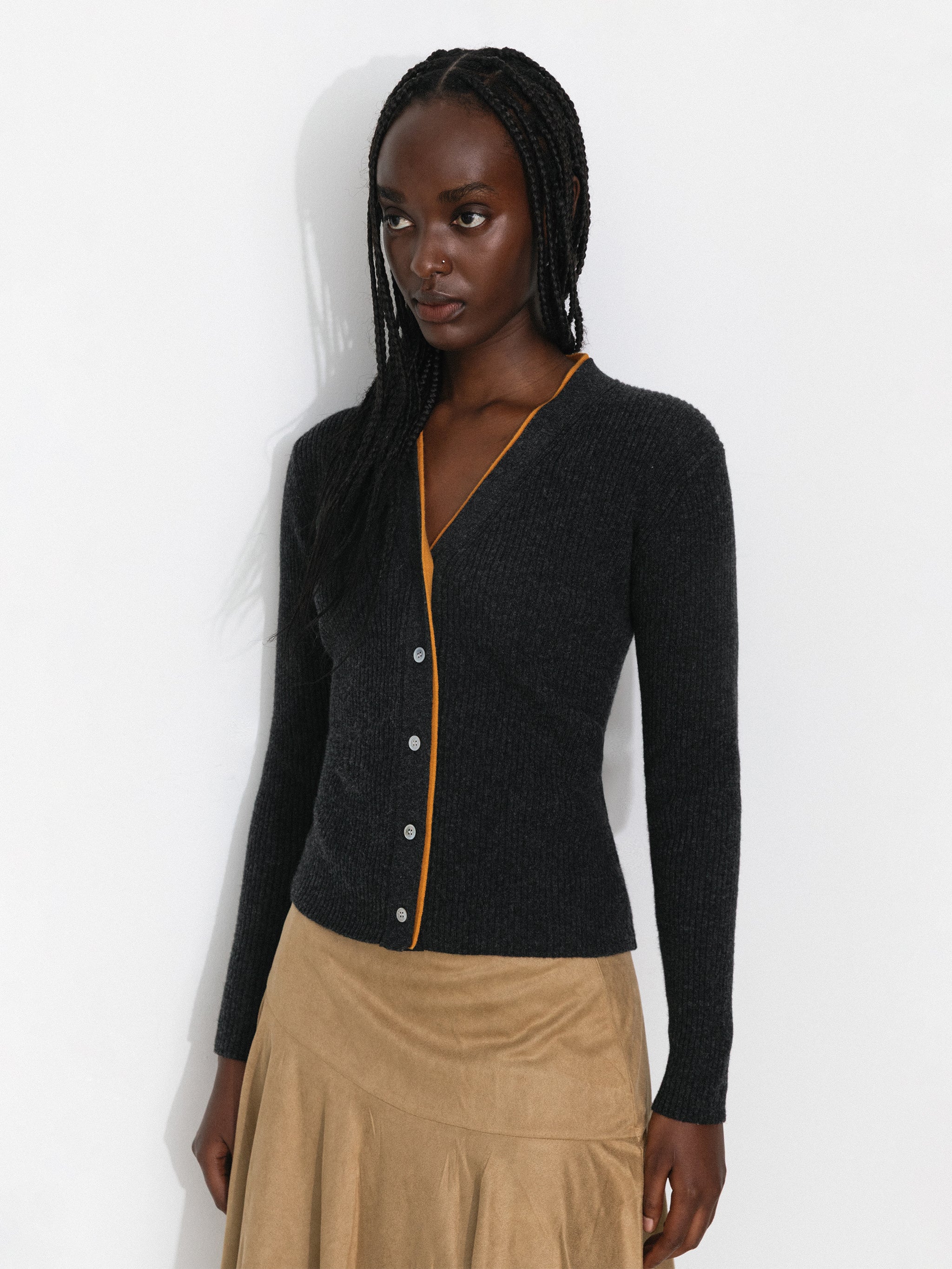 A stylish wool knit top featuring a contrast placket for a modern, eye-catching look. The V-neckline elongates the neck and adds elegance, while glossy shell buttons bring a refined vintage touch. Simple, versatile, and effortlessly elevated.