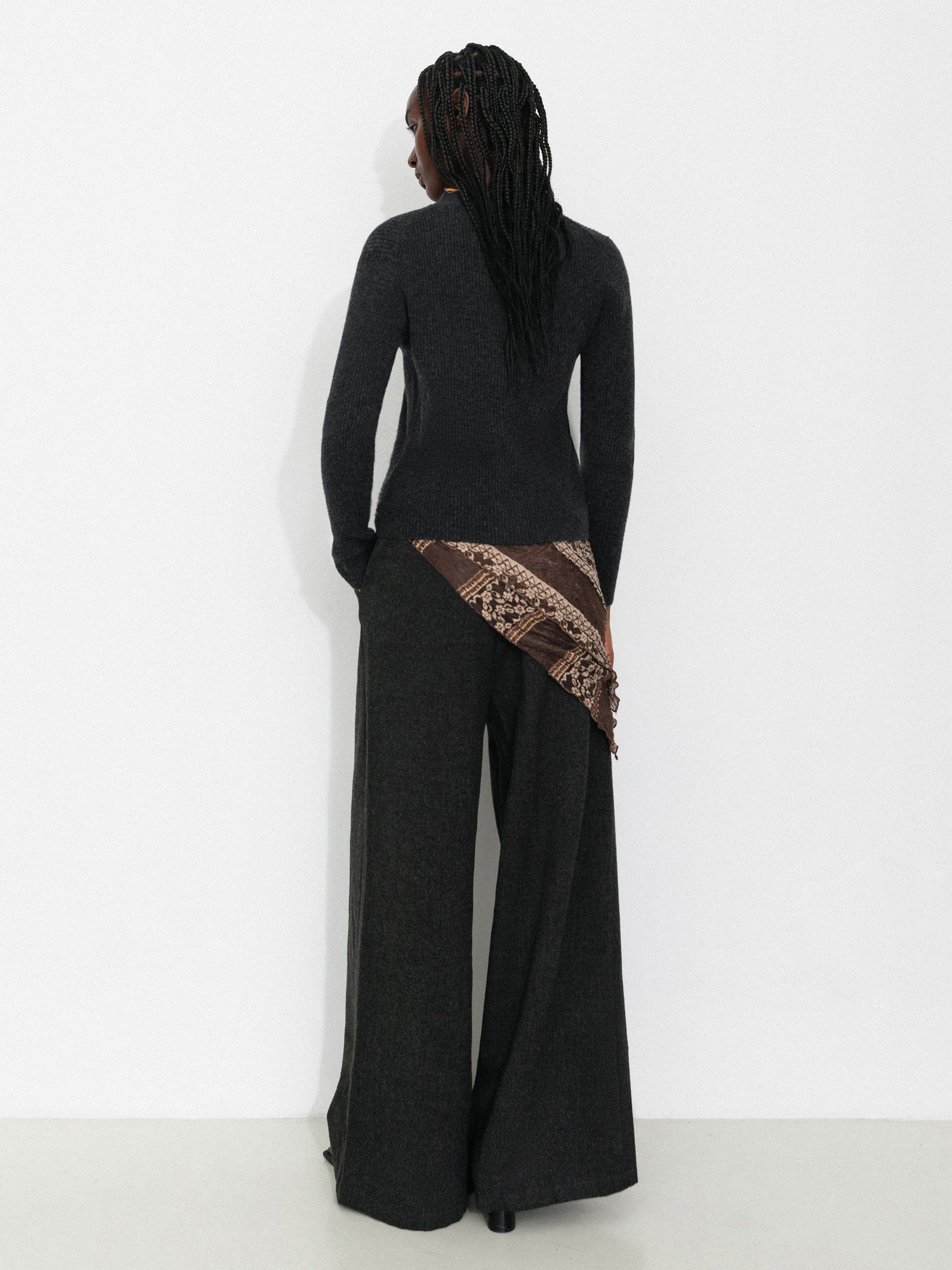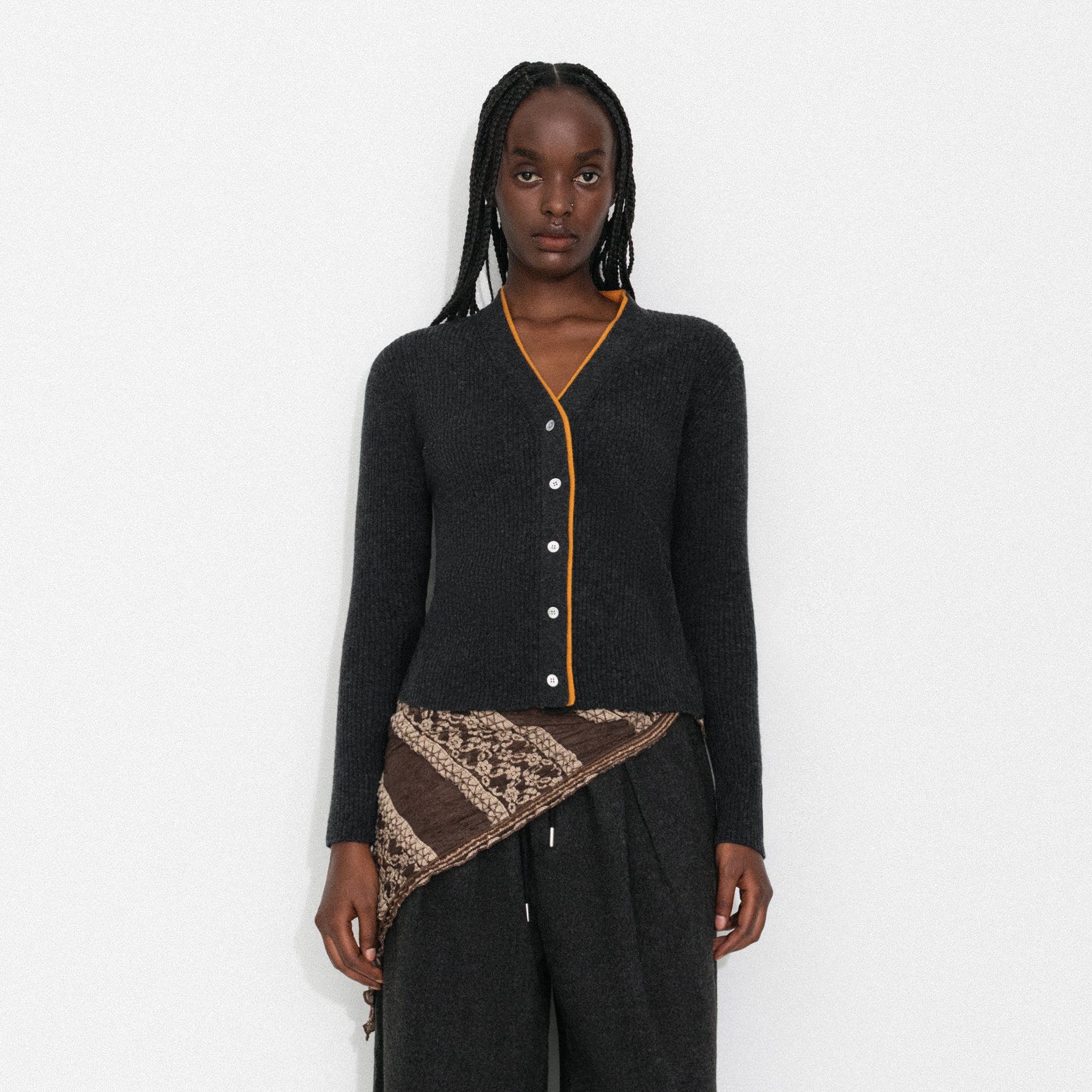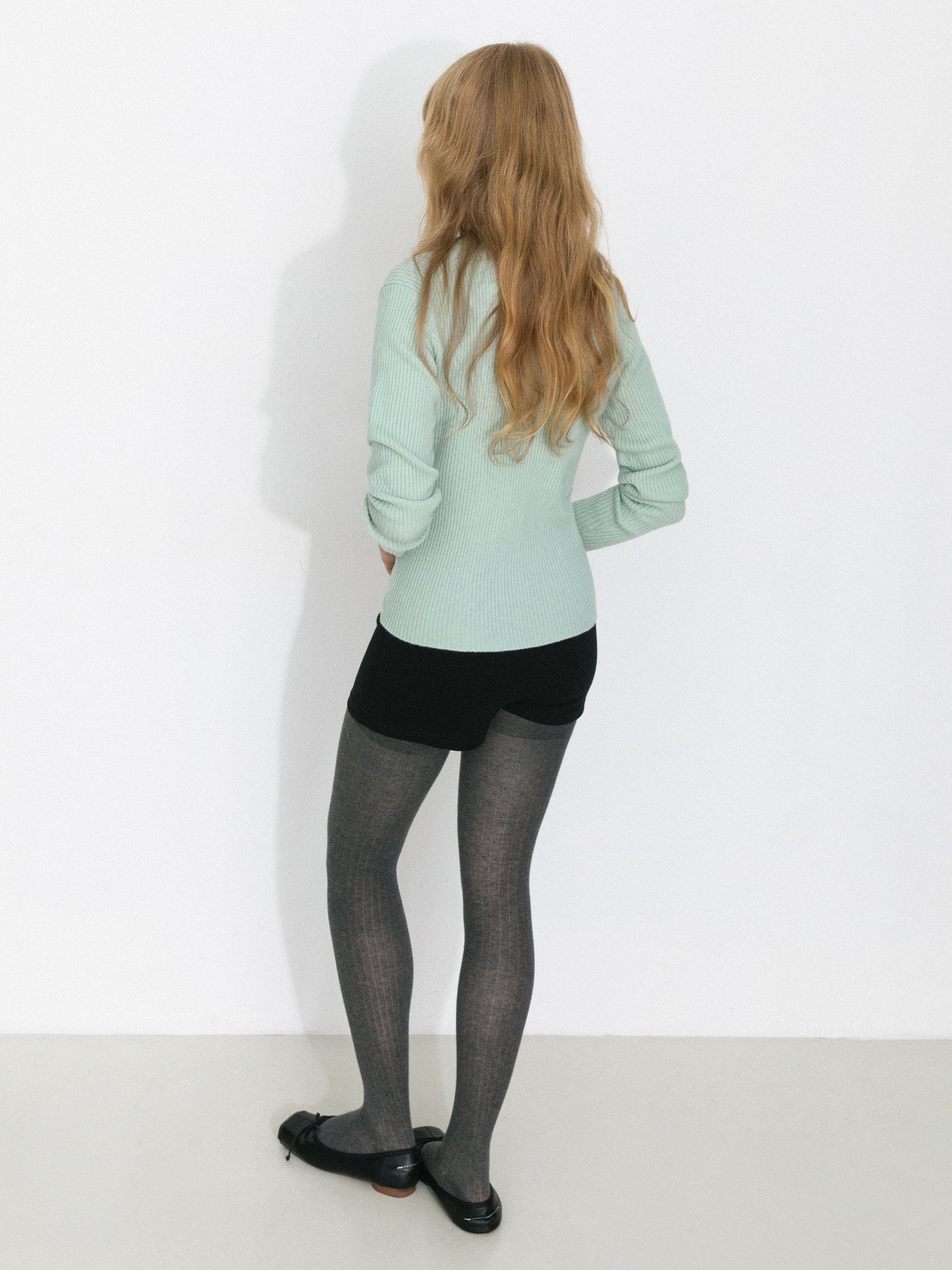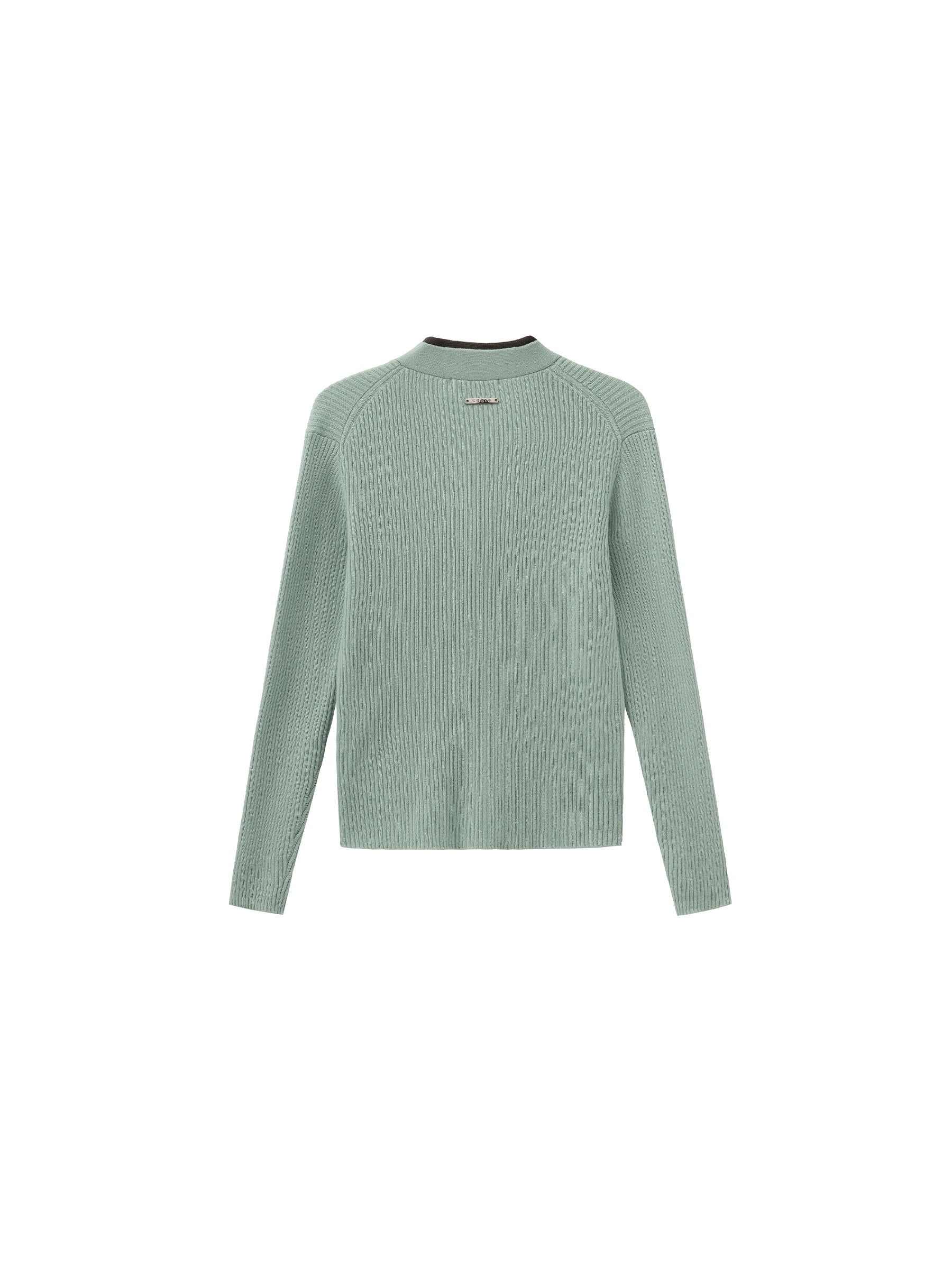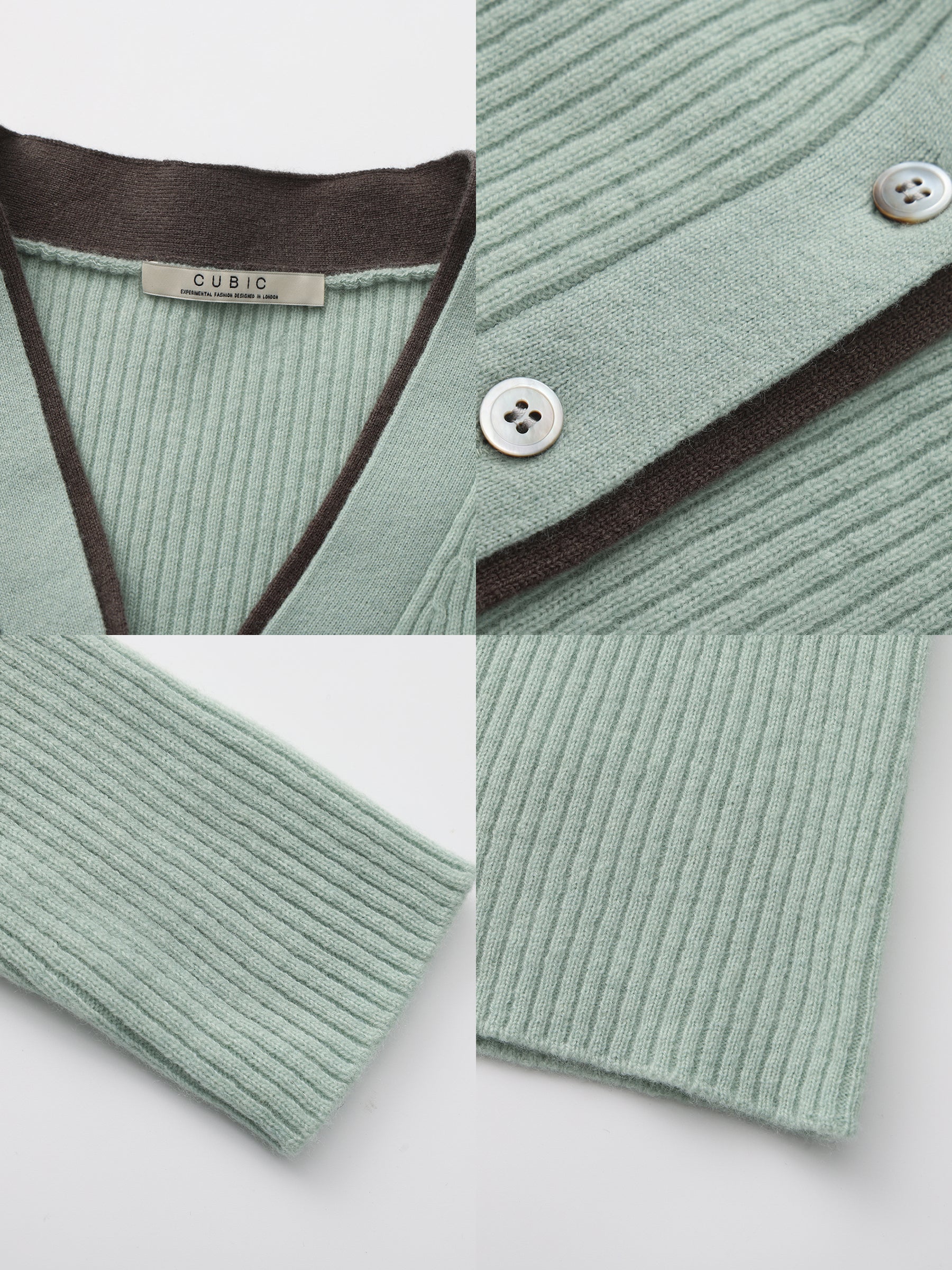A stylish wool knit top featuring a contrast placket for a modern, eye-catching look. The V-neckline elongates the neck and adds elegance, while glossy shell buttons bring a refined vintage touch. Simple, versatile, and effortlessly elevated.