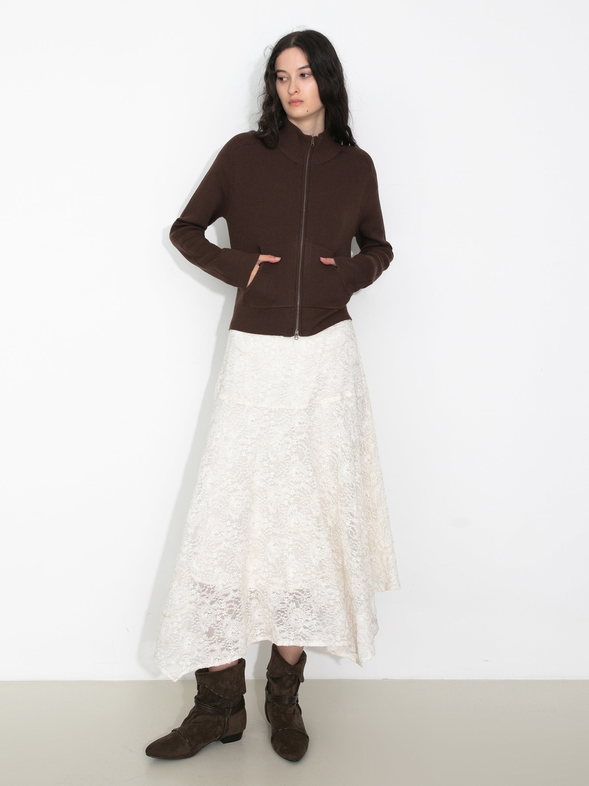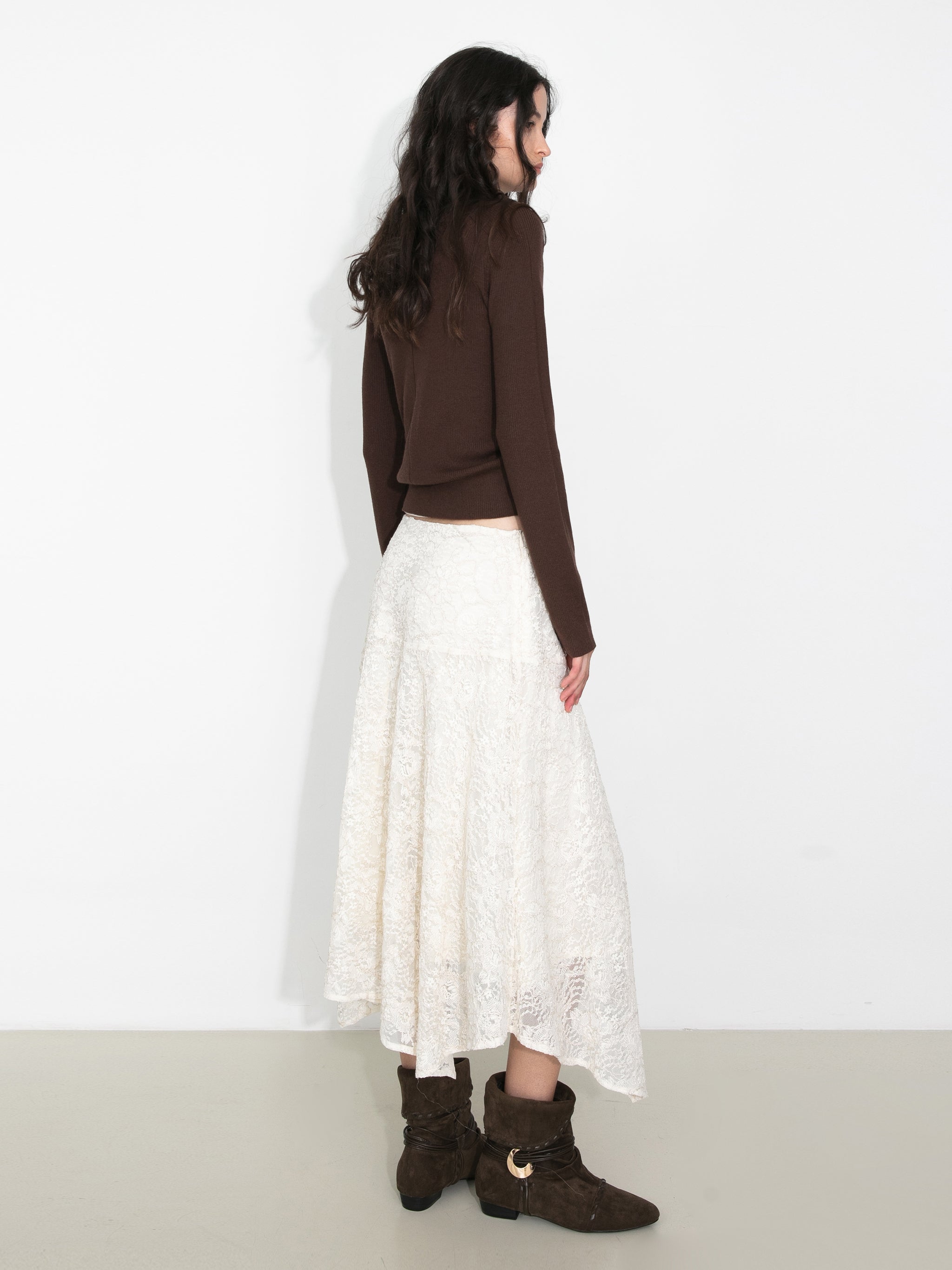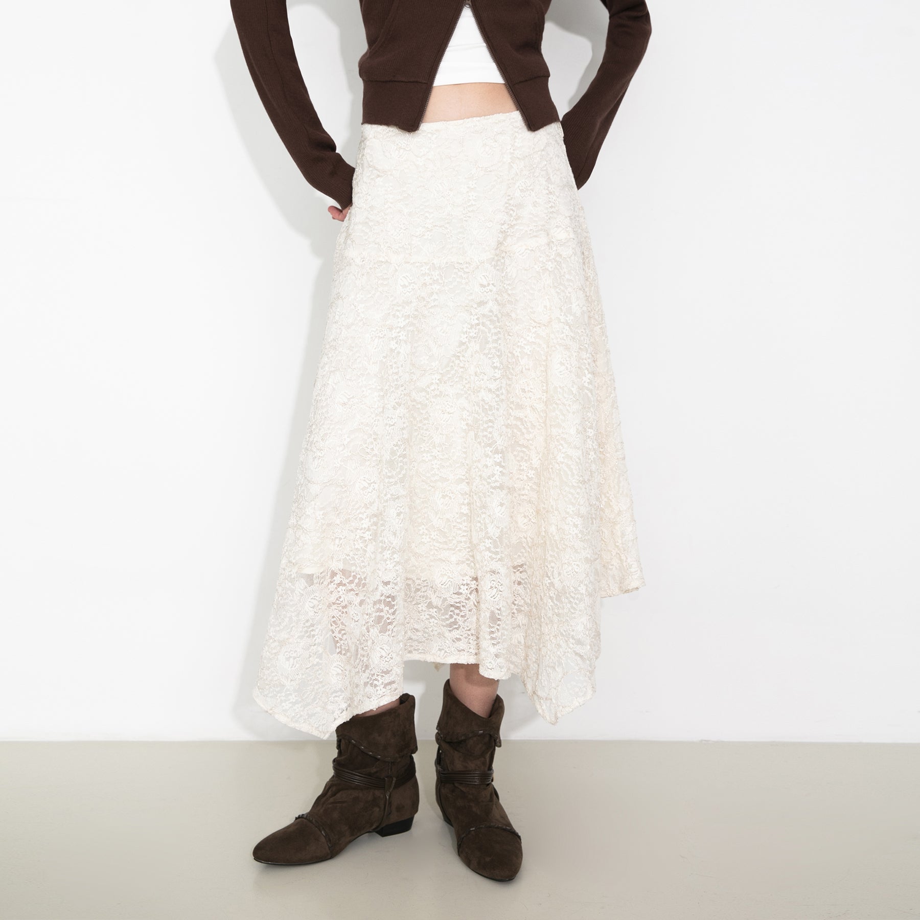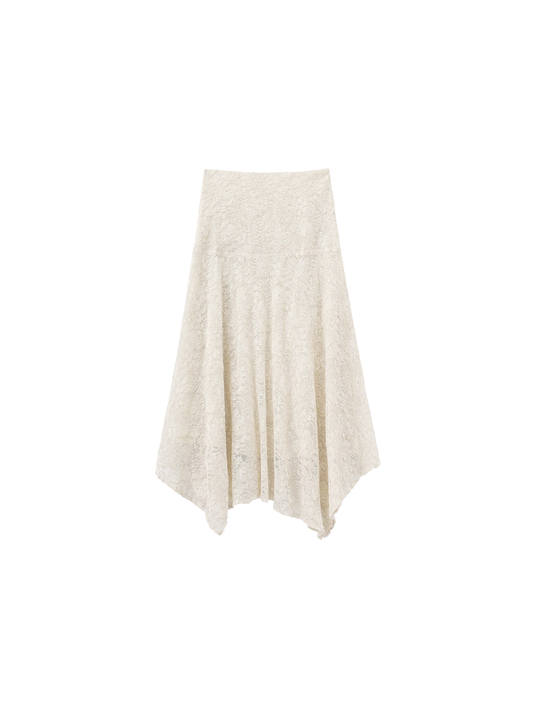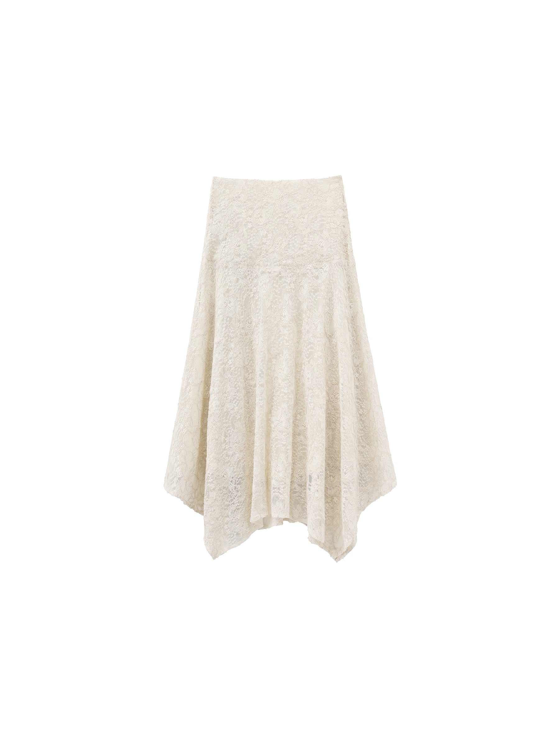 Asymmetrical lace-embroidered skirt in beige. This A-line skirt features an irregular hem and is crafted from lace fabric with exclusive, intricate embroidery for a standout, elegant finish. The fabric composition is 90% cotton 10% spandex. Model wears size M, which is suitable for UK size 10. Product Code: COBES6009