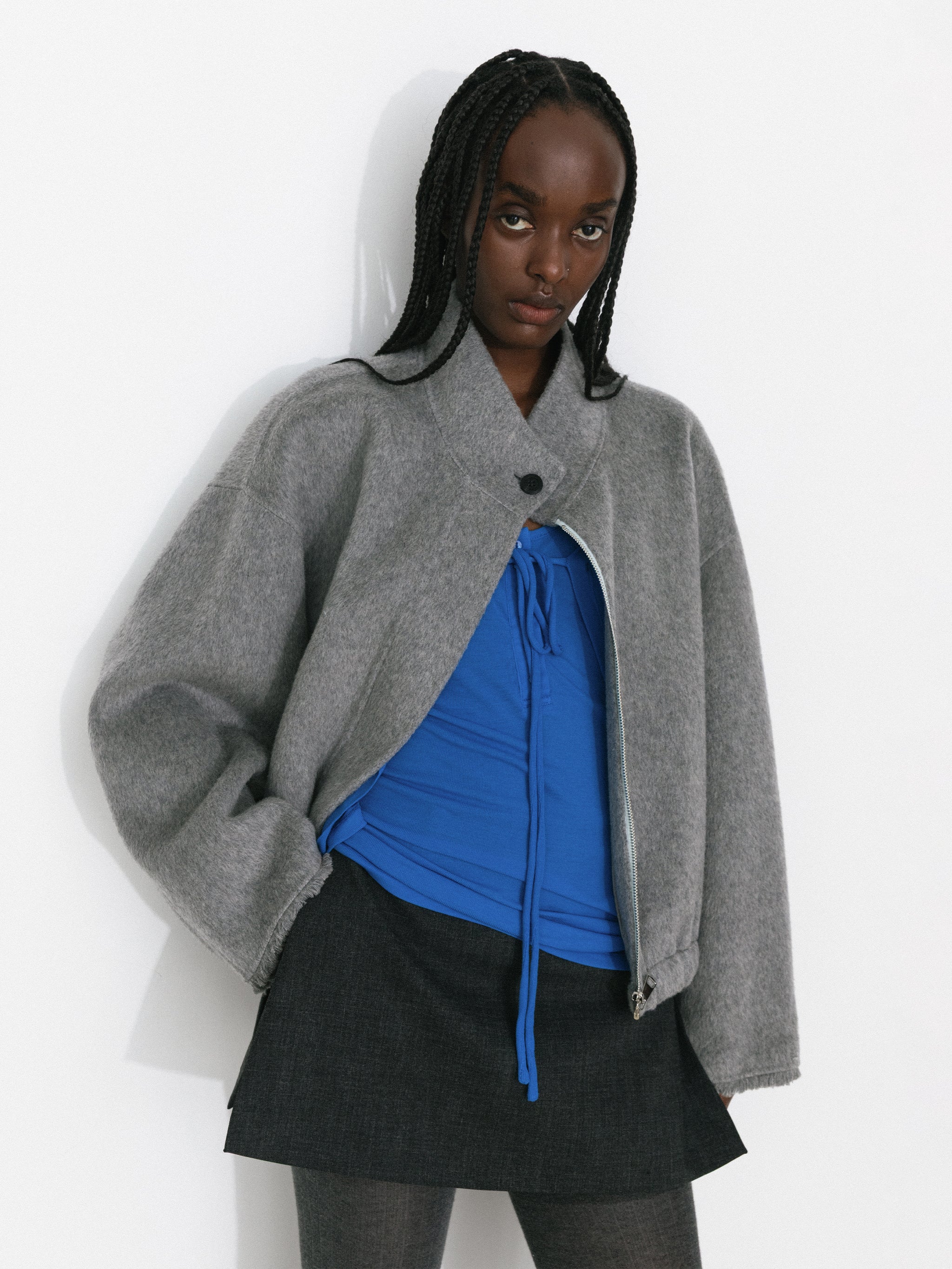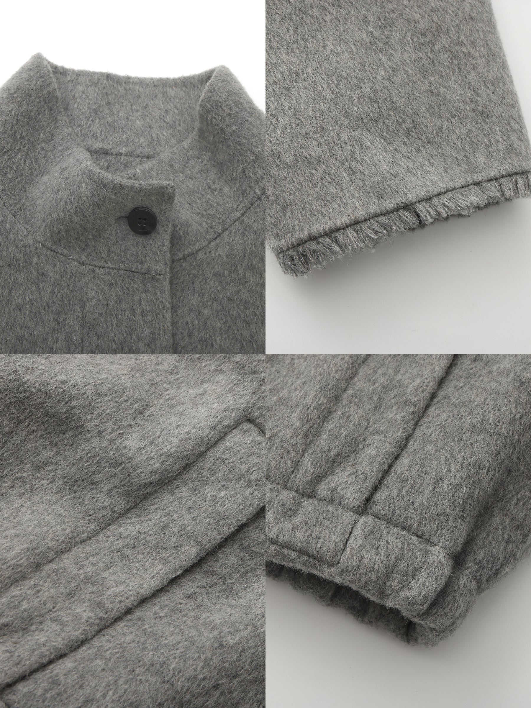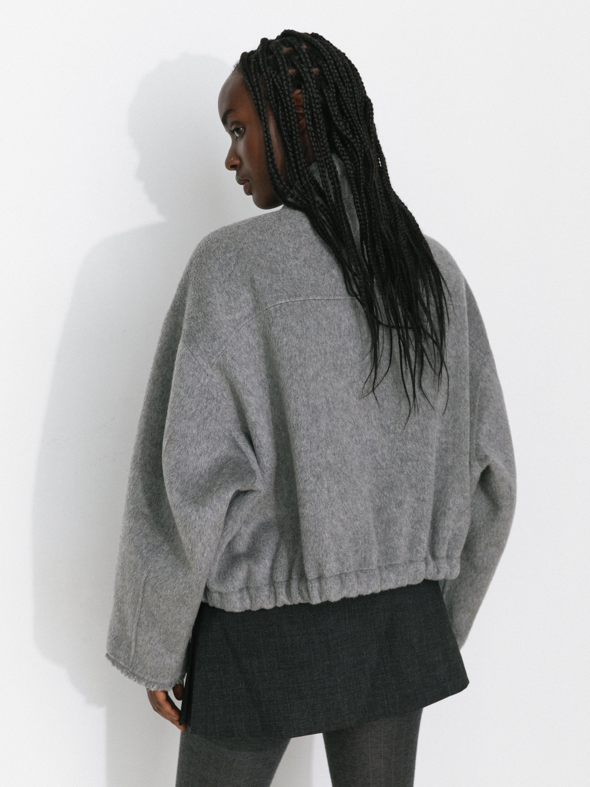 Cocoon Zip-Up Jacket with Raw Edge Cuffs. Relaxed cocoon silhouette with a sleek stand-up collar, smooth zipper, and practical pockets. Raw edge cuffs add a vintage touch. Versatile, flattering, and easy to wear for daily outings, work, or casual gatherings.