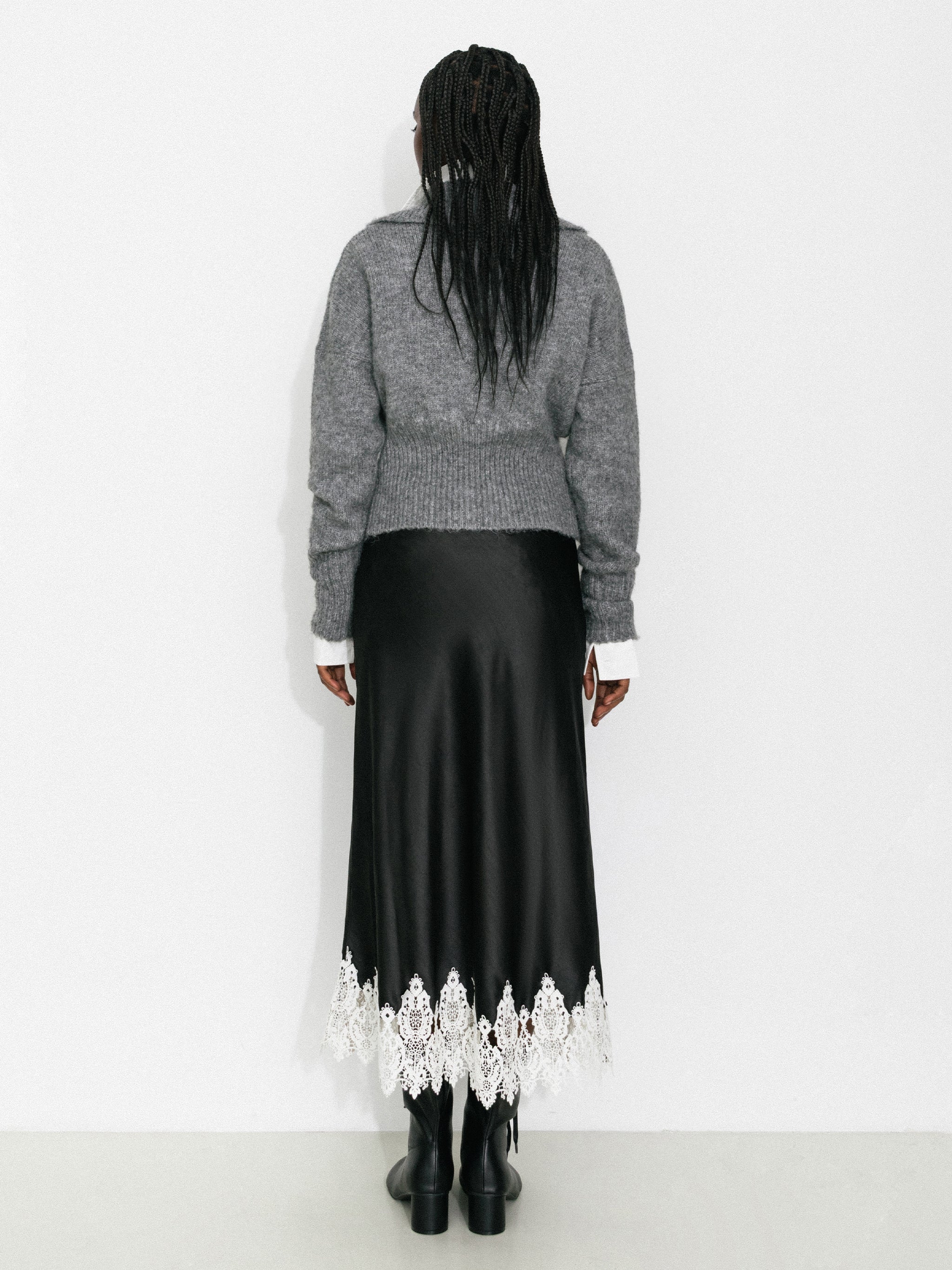 The ribbed hem hugs the waist with gentle elasticity, highlighting your silhouette, and the textured contrast between the ribbing and the alpaca-blend fabric adds refined detail to the cardigan. Fabric Composition: 53% Acrylic, 18% Nylon, 18% Polyester, 10% Wool, 1% Spandex.