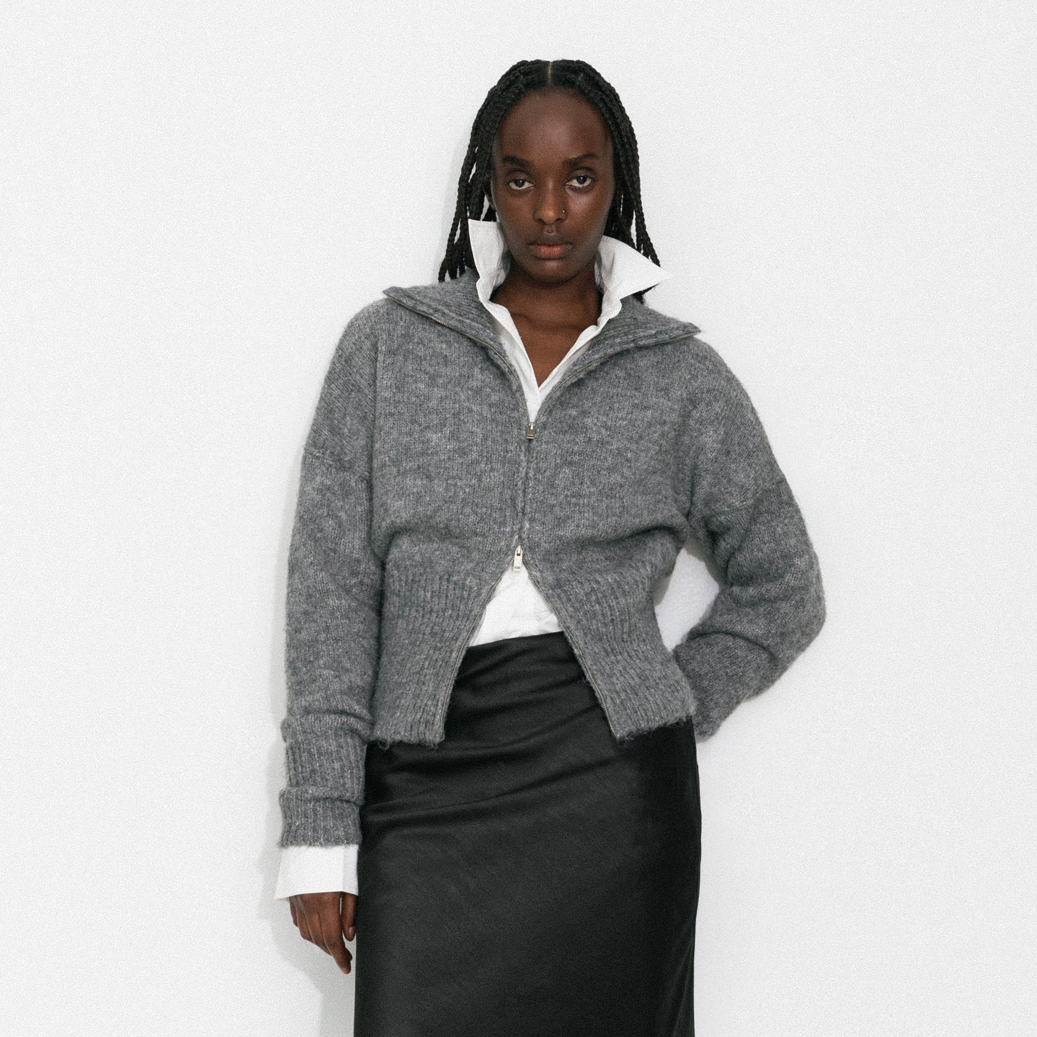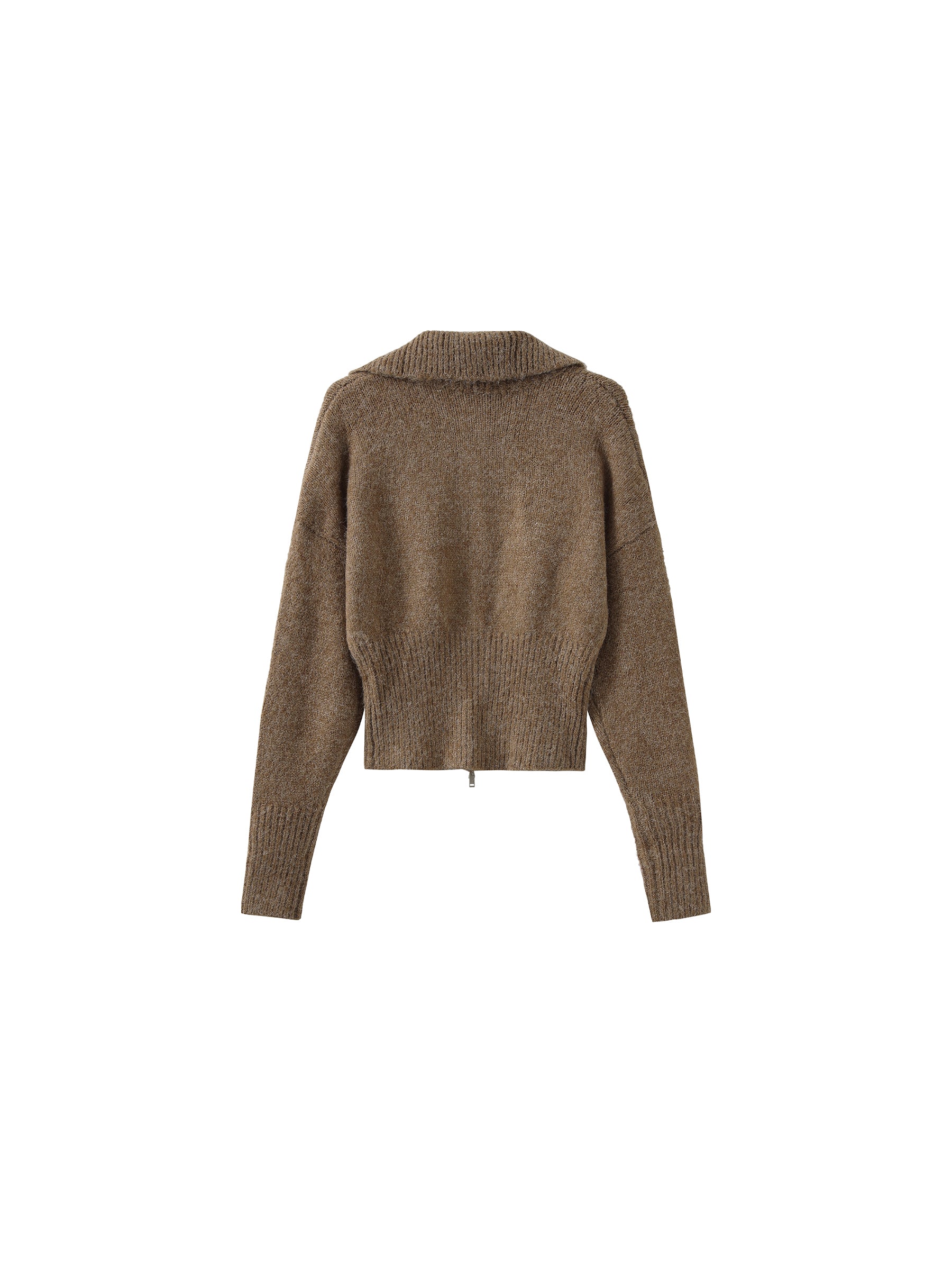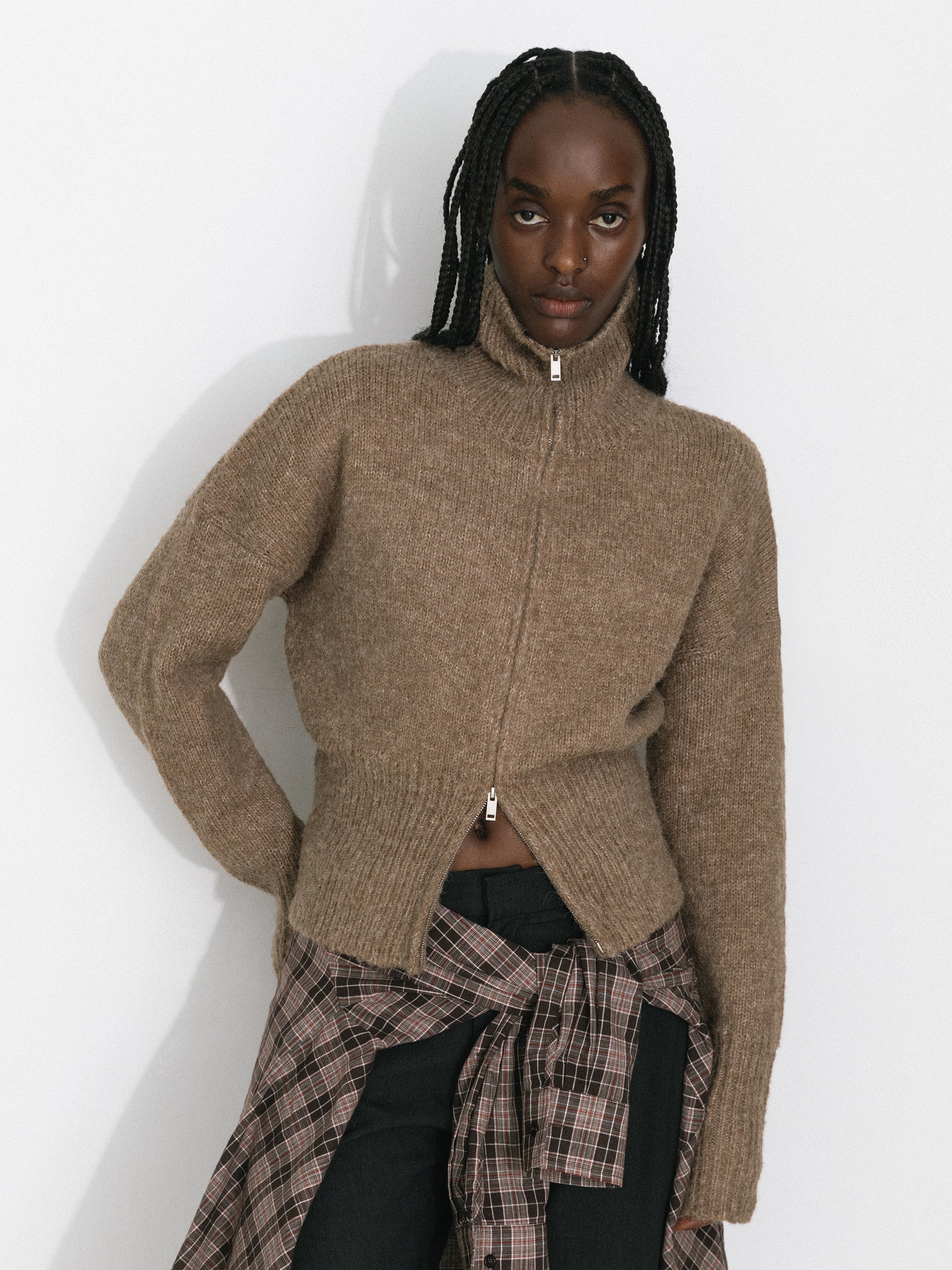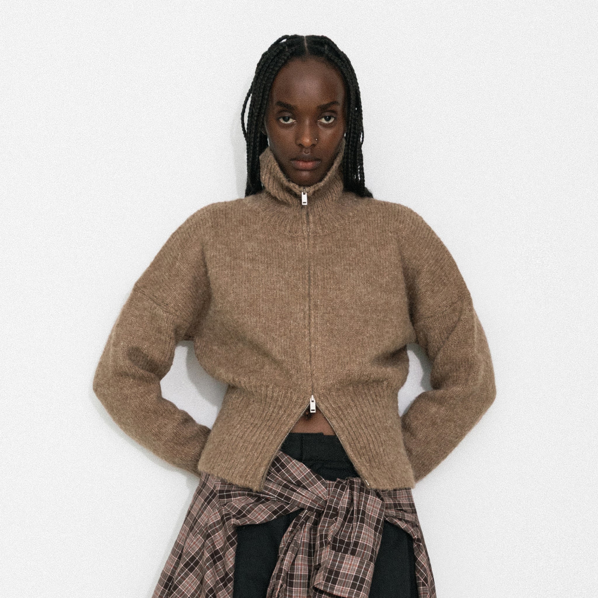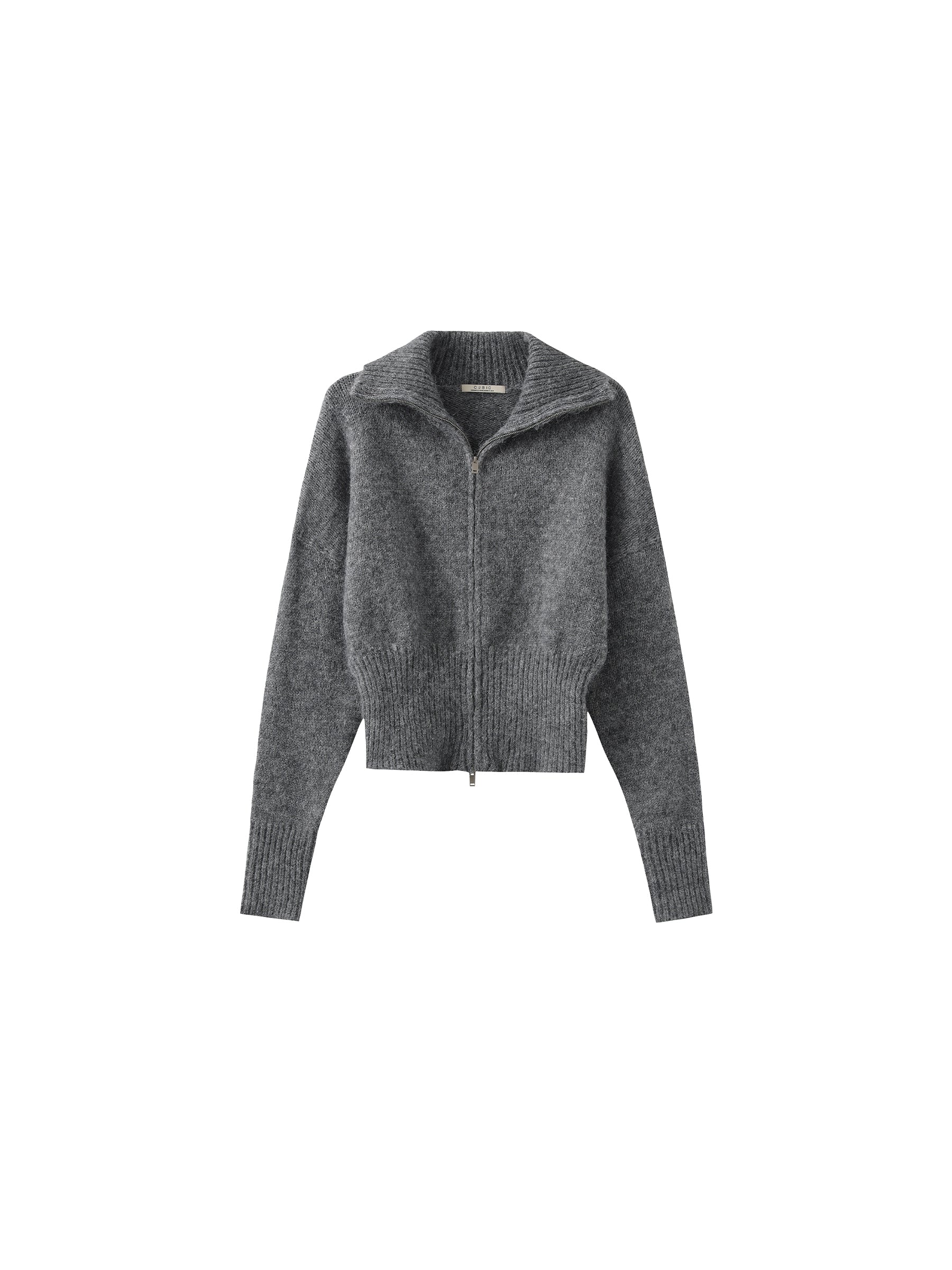 Retro Stand Collar Zip-Up Cardigan. Crafted with a relaxed, waist-defining silhouette, this cardigan offers a cozy fit when worn alone in autumn and layers effortlessly under coats or down jackets in winter. Featuring a two-way zipper, it allows easy adjustment of opening for convenience and style. The stand collar provides wind protection while adding a chic touch.