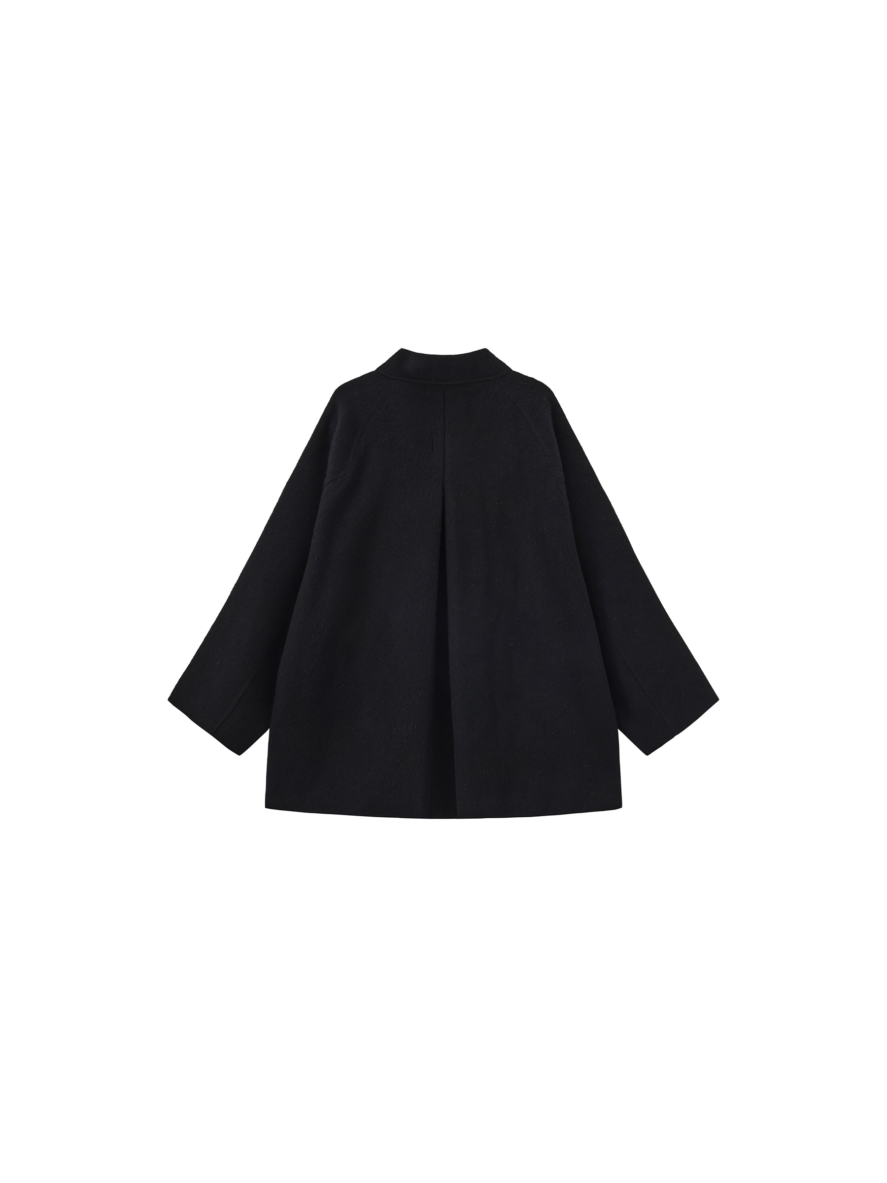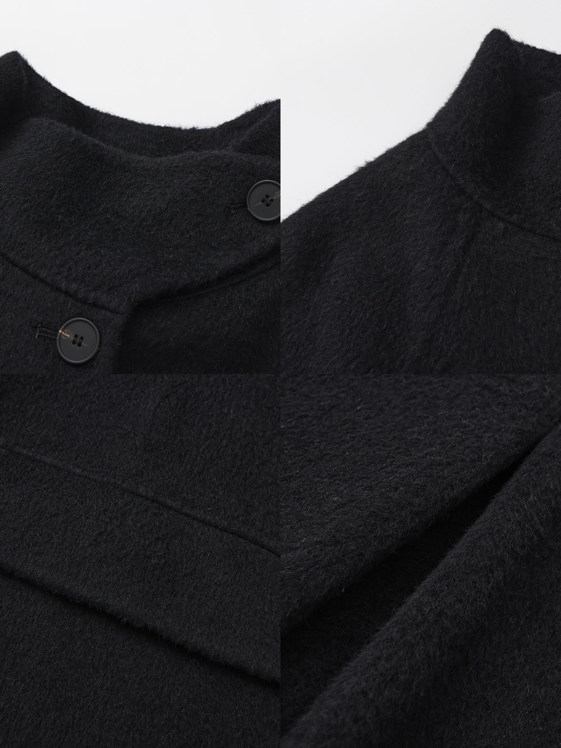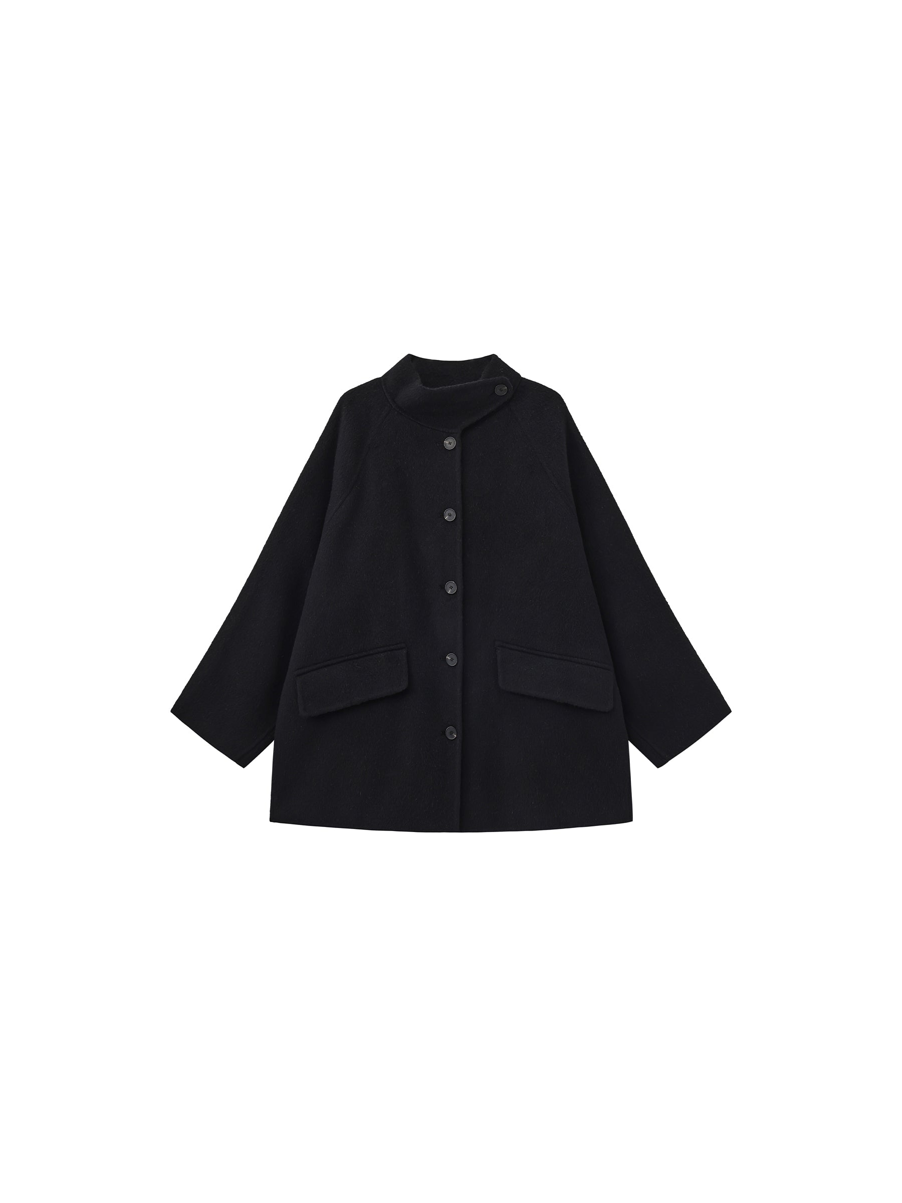 This mid-length coat features a sleek stand collar that adds a refined, structured look while keeping you warm. Designed with comfortable raglan sleeves, it offers effortless movement and a relaxed yet sophisticated silhouette. Crafted from hand-stitched double-faced wool, the coat combines structure and softness, creating a seamless, high-quality finish with a modern, stylish appeal.