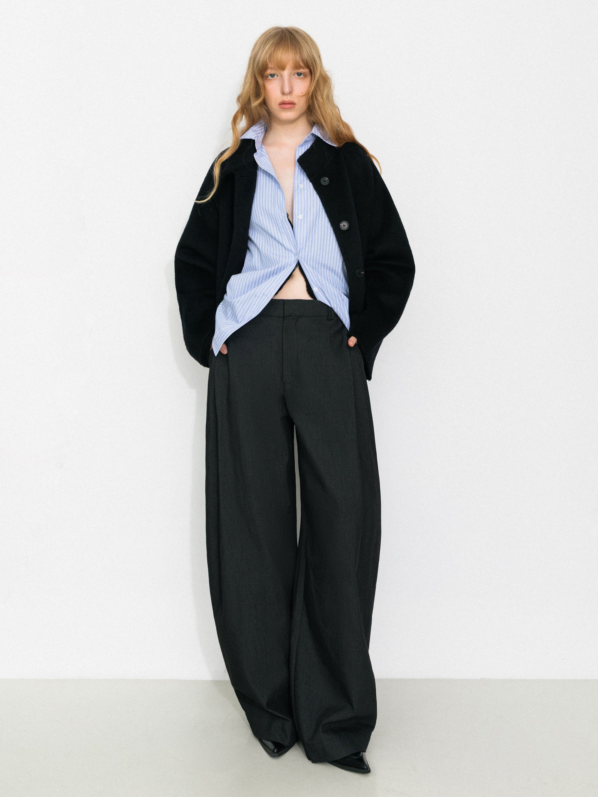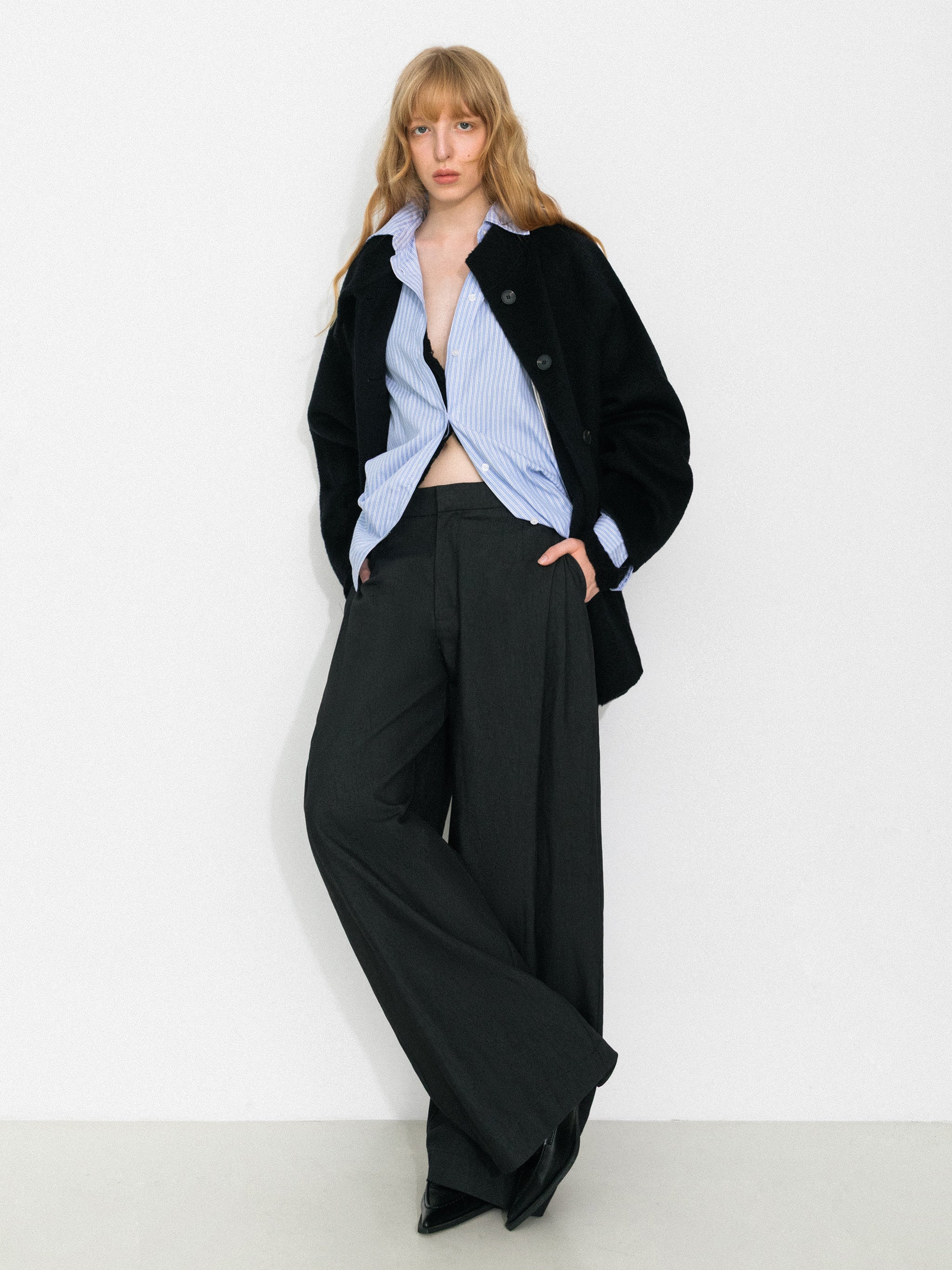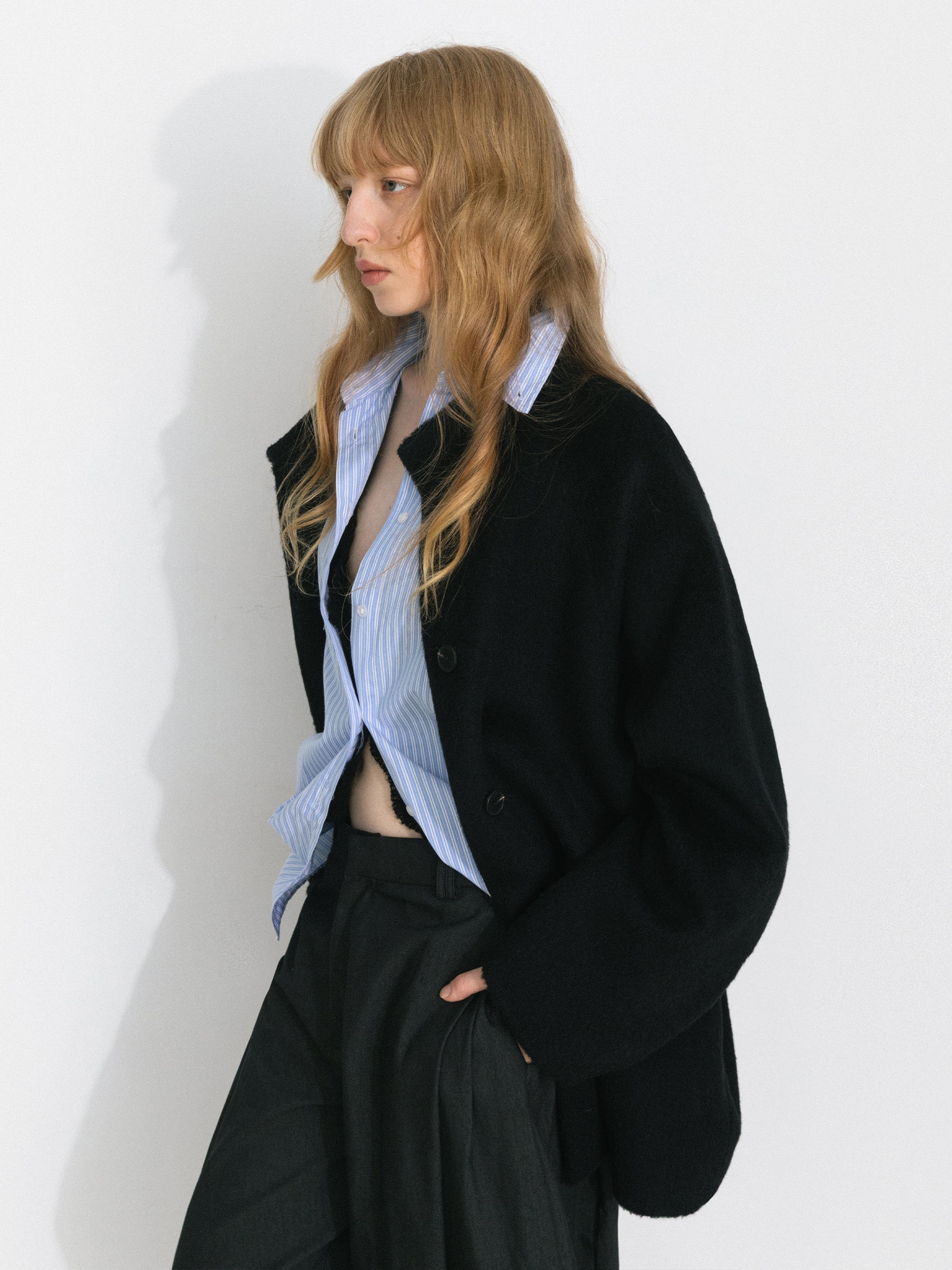 This mid-length coat features a sleek stand collar that adds a refined, structured look while keeping you warm. Designed with comfortable raglan sleeves, it offers effortless movement and a relaxed yet sophisticated silhouette. Crafted from hand-stitched double-faced wool, the coat combines structure and softness, creating a seamless, high-quality finish with a modern, stylish appeal.